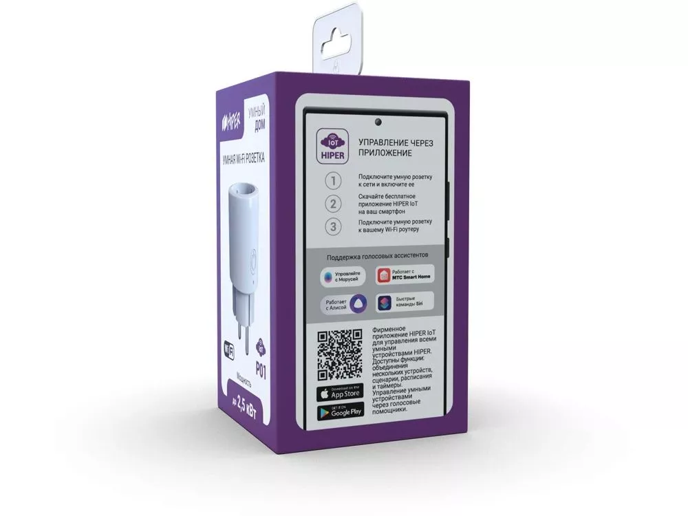 Умная розетка HIPER IoT P01 предназначена для удаленного включения/выключения электроприборов, а также для поддержки исполняемых сценариев. Поддержка голосовых помощников Яндекс Алиса и Google Home. Управлять включением/выключением данной розетки возможно, как при помощи умных колонок, так и через голосовые помощники на телефоне или планшете. Простота установки и настройки. Чтобы установить эту розетку, не нужно быть электриком, достаточно ее воткнуть в действующую розетку и настроить в соответствии с инструкцией. Удобство настройки сценариев HIPER IoT. Простая и интуитивно понятная настройка сценариев. Поддержка облачных технологий. Благодаря облачным технологиям устройства умного дома от HIPER, могут работать полностью автономно (без управляющих модулей), достаточно лишь подключить устройство к приложению и обеспечить доступ к Wi-Fi и Internet. Безопасность и дистанционное включение/отключение. Для удаленного выключения/включения необходимо обеспечить подключение розетки к WiFi и смартфона/планшета к интернету, теперь по дороге на работу, не нужно переживать отключили ли вы утюг, достаточно зайти в приложение, проверить, и при необходимости выключить. Управление по расписанию. В соответствующем разделе приложения розетку можно включать и выключать, в том числе по таймеру обратного отсчета и по расписанию. Сохранение настроек при выключении электроэнергии. При включении-отключении от сети розетка восстанавливает последнее состояние — если они были выключены, то выключенными и останутся.