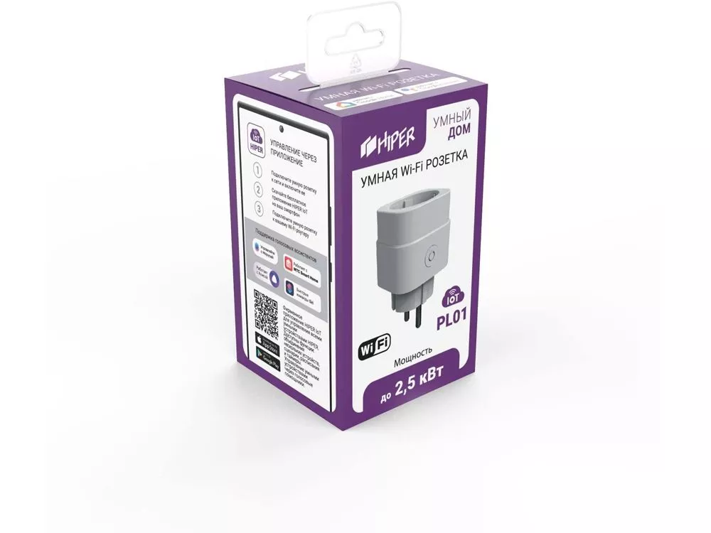 Умная розетка HIPER IoT PL01 предназначена для удаленного включения/выключения электроприборов, а также для поддержки исполняемых сценариев. К ключевым особенностям модели можно отнести: • Поддержка голосовых помощников Яндекс Алиса и Google Home. • Управлять включением/выключением данной розетки возможно, как при помощи умных колонок, так и через голосовые помощники на телефоне или планшете. • Простота установки и настройки. Чтобы установить эту розетку, не нужно быть электриком, достаточно ее воткнуть в действующую розетку и настроить в соответствии с инструкцией. • Удобство настройки сценариев HIPER IoT. Простая и интуитивно понятная настройка сценариев. • Поддержка облачных технологий. Благодаря облачным технологиям устройства умного дома от HIPER, могут работать полностью автономно (без управляющих модулей), достаточно лишь подключить устройство к приложению и обеспечить доступ к Wi-Fi и Internet. • Безопасность и дистанционное включение/отключение. Для удаленного выключения/включения необходимо обеспечить подключение розетки к WiFi и смартфона/планшета к интернету, теперь по дороге на работу, не нужно переживать отключили ли вы утюг, достаточно зайти в приложение, проверить, и при необходимости выключить. • Управление по расписанию. В соответствующем разделе приложения розетку можно включать и выключать, в том числе по таймеру обратного отсчета и по расписанию. • Сохранение настроек при выключении электроэнергии. При включении-отключении от сети розетка восстанавливает последнее состояние — если они были выключены, то выключенными и останутся.