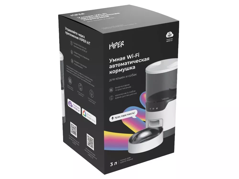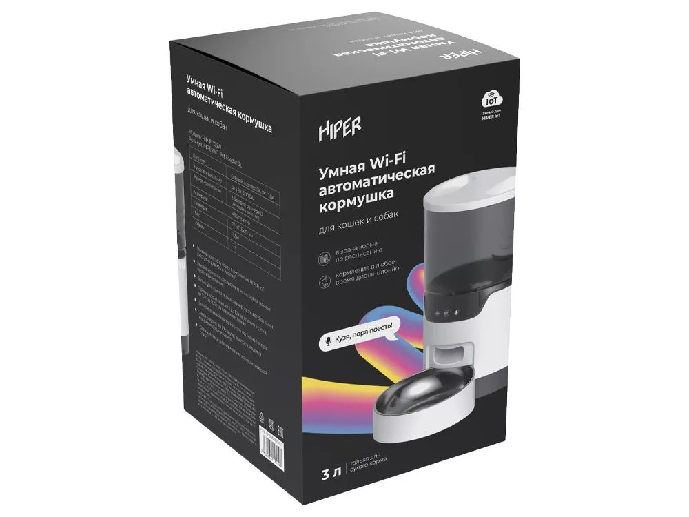 Умная автокормушка HIPER идеальный девайс, который оценят и питомцы, и хозяева. Устройство с автоподачей корма имеет контейнер на 3 литра сухого корма, этого объема хватит для кошки или маленькой собаки на 7-10 дней. Внутри контейнера имеется специальный фильтр, который защищает сухой корм от влаги. Также конструкция предусматривает встроенный вращающийся механизм, который обеспечивает равномерную подачу корма через широкое отверстие. Вы можете отрегулировать размер порции от 10 до 200 грамм. Расписание кормления можно настроить в бесплатном приложении HIPER IoT для всех смартфонов на Android и iOS, там же вы можете покормить питомца дистанционно в любой момент, где бы вы ни были. Чтобы питомец знал о кормлении, хозяин может записать своим голосом команду или звук, который будет сигнализировать четвероногому другу о том, что в миске появился корм. Чтобы питомец не остался без еды при внезапном отключении электроэнергии, кормушка имеет альтернативный источник питания через три батарейки типа D. Во время сбоев в сети кормушка автоматически перейдет на автономную энергию и не оставит питомца без еды. Тампопечать (1 цвет (белые изделия)) на данный товар осуществляется бесплатно. Оплачивается только настройка оборудования в размере 4000 рублей на весь тираж.
