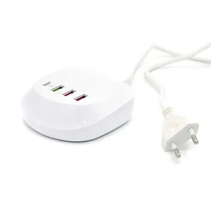Универсальная платформа для зарядки гаджетов, с возможностью одновременного подключения 4 устройств. Порт Type-C подойдет для ноутбуков и нетбуков, порты USB позволяют при помощи кабеля с нужным типом порта осуществить зарядку мобильных телефонов, планшетов, наушников, часов. Наличие порта с функцией QC позволяет заряжать устройство в ускоренном режиме. Платформа выполнена из негорючего пластика, имеет встроенные компоненты предохраняющие устройства от перепадов напряжения