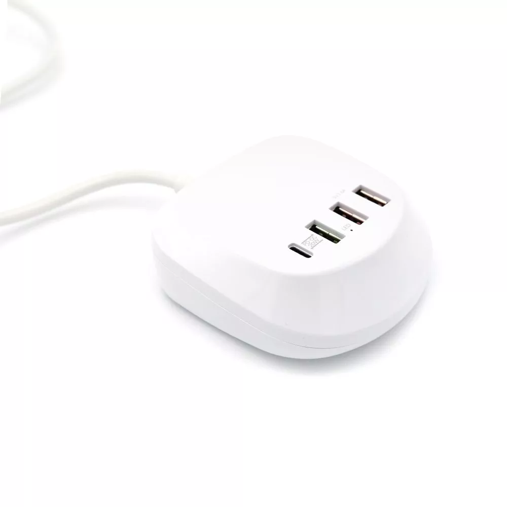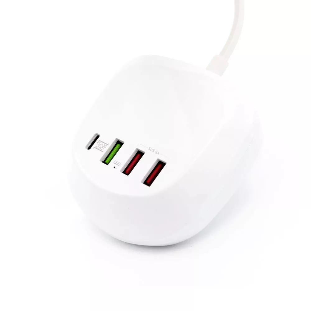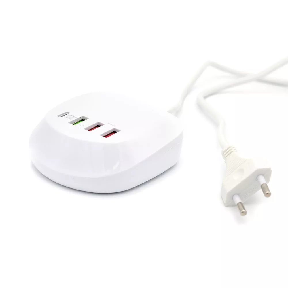 Универсальная платформа для зарядки гаджетов, с возможностью одновременного подключения 4 устройств. Порт Type-C подойдет для ноутбуков и нетбуков, порты USB позволяют при помощи кабеля с нужным типом порта осуществить зарядку мобильных телефонов, планшетов, наушников, часов. Наличие порта с функцией QC позволяет заряжать устройство в ускоренном режиме. Платформа выполнена из негорючего пластика, имеет встроенные компоненты предохраняющие устройства от перепадов напряжения
