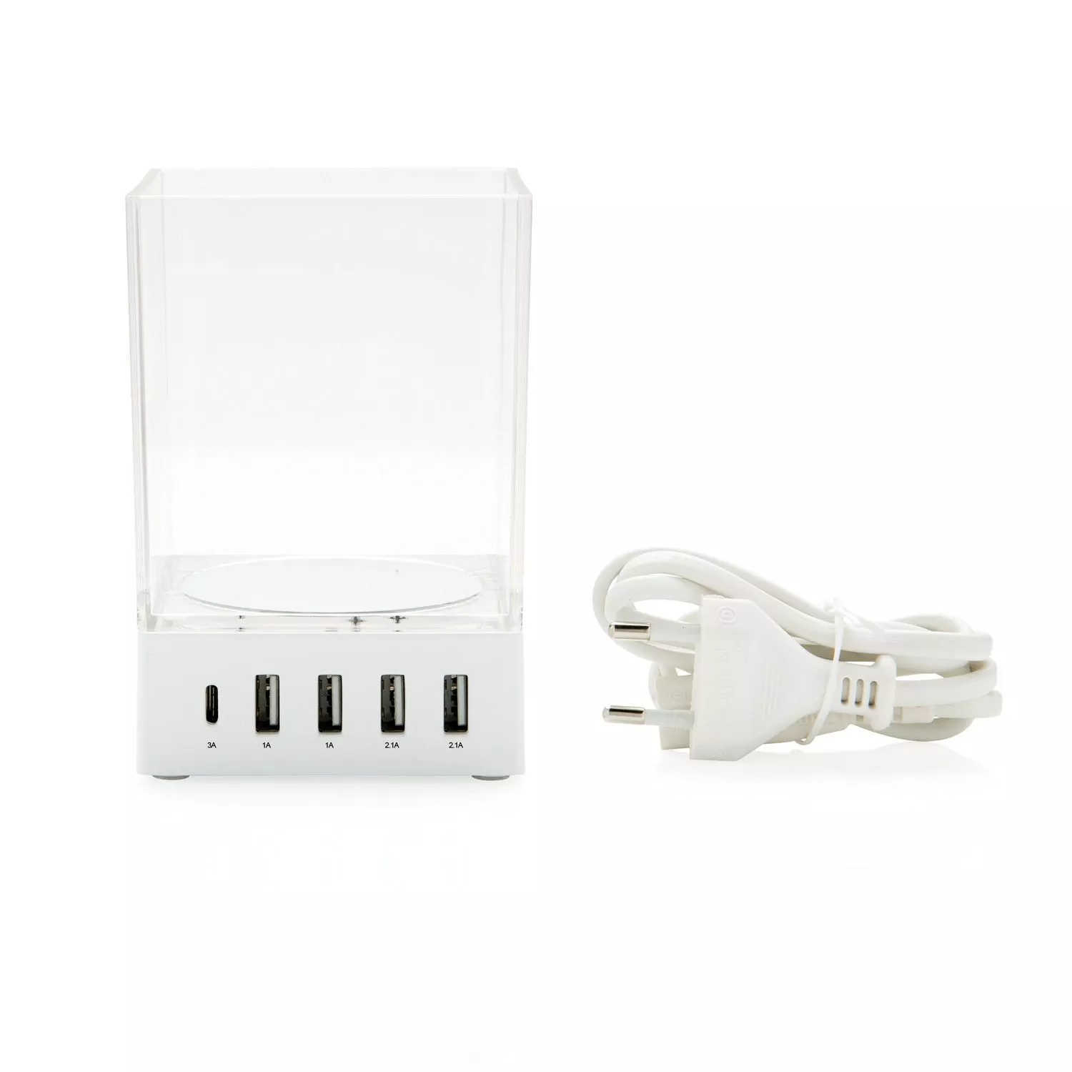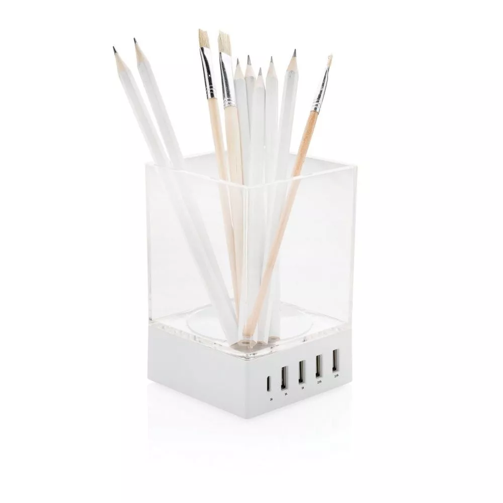 Стильный USB-хаб с подставкой для ручек, выполненный в минималистичном дизайне, проследит, чтобы все устройства были заряжены, а на рабочем столе царил порядок. В устройстве предусмотрены 4 порта USB (4,8А) и один порт Type-C 2.0 для мобильных устройств нового поколения. Индикаторы синего цвета покажут, заряжается ли устройство. Подставка изготовлена из поликарбоната, а USB-хаб из огнестойкого ABS-пластика. Длина кабеля - 1,5 метра.