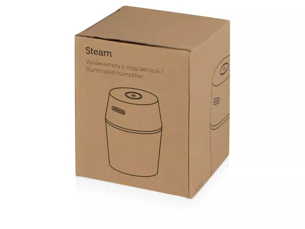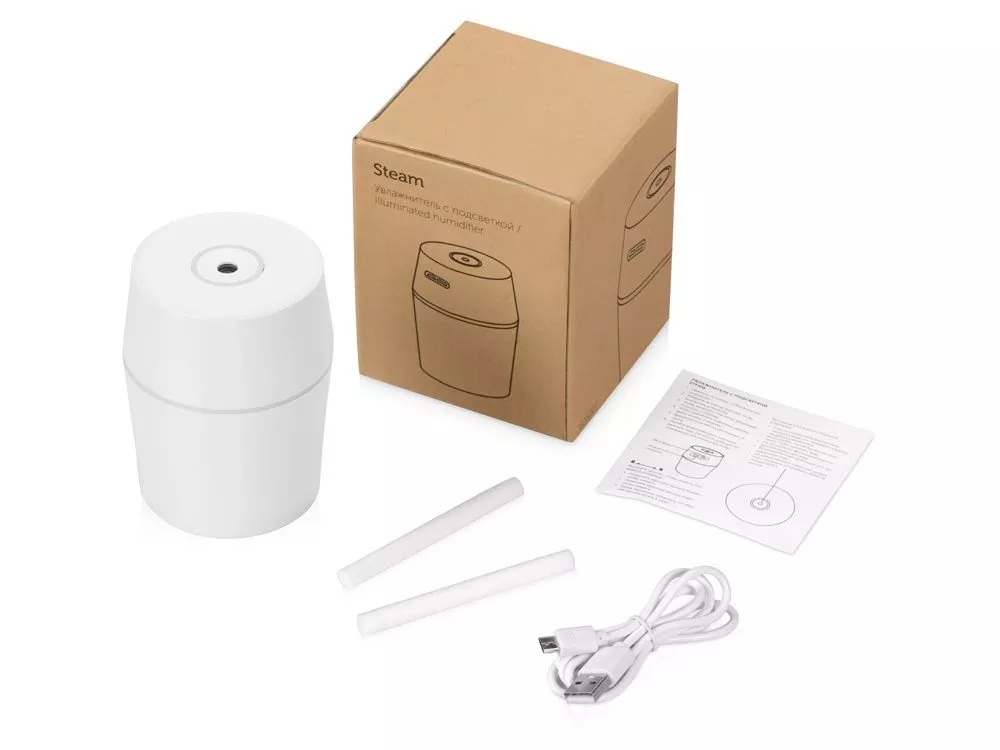 USB Увлажнитель воздуха с голубой подсветкой Steam: • Мобильный и легкий, всего 85 гр • Мощность 1,5 Вт. • Емкость 200 мл. • Режим ночной подсветки. • Питание от USB-кабеля (идёт в комплекте). • Для использования в офисе, в машине или дома. • Инструкция в комплекте. • Упакован в крафтовую коробку. • Компактный и простой в использовании. • Область применения: 10 м². Не разрешается добавлять ароматические масла в увлажнитель. Тампопечать (1 цвет (белые изделия)) на данный товар осуществляется бесплатно. Оплачивается только настройка оборудования в размере 7300 рублей на весь тираж.