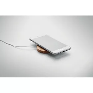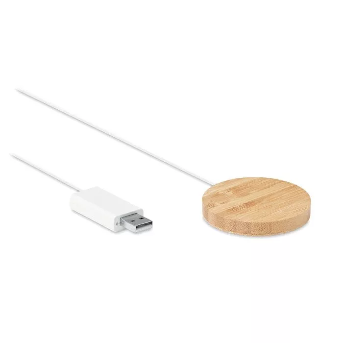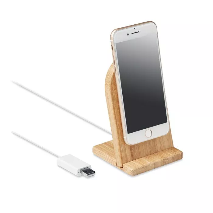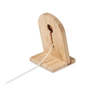 Магнитная б/п зарядка из бамбука с подставкой. Выход: DC 9V/1.1A (10W). Совместимо с iPhone® 12 и новее. Включает металлическое кольцо для зарядки дополнительных устройств, поддерживающих функции б/п зарядки.