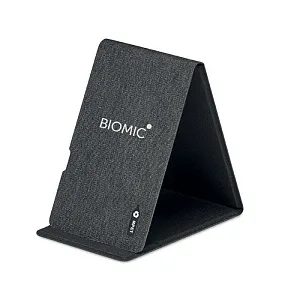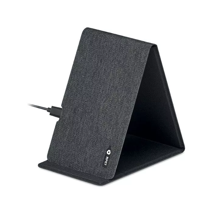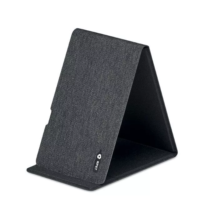 Подставка для телефона с беспроводной зарядкой на 10 Вт из RPET 300D. Выход: 9V/1,1А (10Вт) для быстрой зарядки. Совместима с последними моделями Androids, iPhone® 8 и новее.