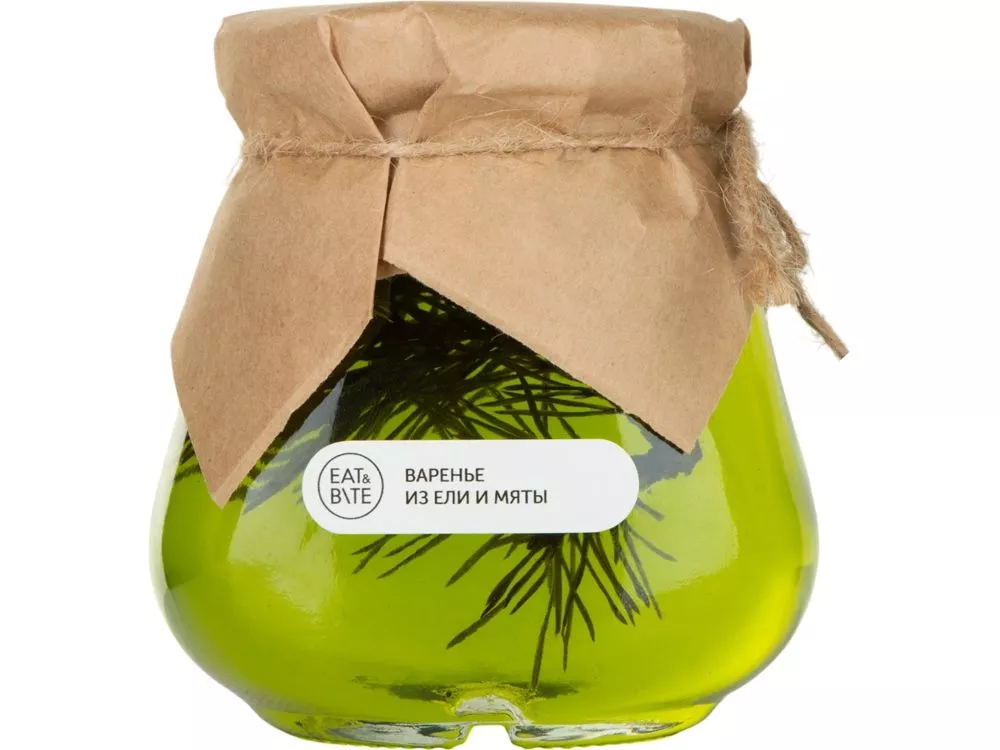 Мы привыкли, что варенье варят из фруктов и ягод. Поэтому рецепт варенья из ели выглядит достаточно необычно. Мята в сочетании с ароматом ели – это вкусный и необыкновенно полезный продукт. Варенье из ели и мяты можно добавлять в различные коктейли, что будет придавать пикантность напитку. Этот вкусный подарок поможет прогнать усталость от дневных забот. Банка варенья обернута крафт-бумагой, на которую возможно сделать нанесение корпоративного логотипа. Тампопечать (1 цвет (цветные изделия)) на данный товар осуществляется бесплатно. Оплачивается только настройка оборудования в размере 8200 рублей на весь тираж.