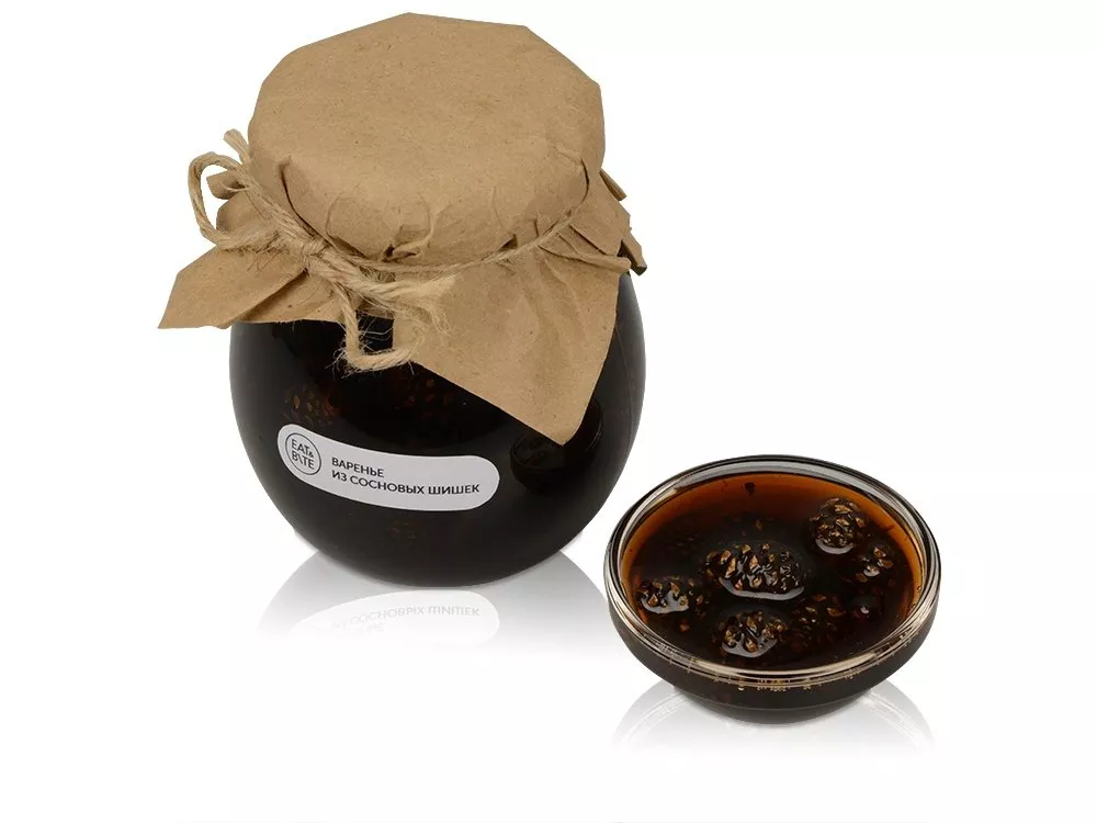 Вам надоели стандартные подарки, и хочется подарить по-настоящему оригинальный и полезный презент? Обратите внимание на варенье из сосновых шишек! Это не просто варенье, а целая аптека в одной баночке. В сосновых шишках, из которых готовится варенье, содержатся фитонциды, эфирные масла, терпингидрат, способствующие выздоровлению при заболеваниях бронхов, легких и суставов. Отличный полезный подарок руководителю или коллеге. Условия хранения при температуре от 2 до 25 градусов. После вскрытия баночку с вареньем хранить в холодильнике. Тампопечать (1 цвет (цветные изделия)) на данный товар осуществляется бесплатно. Оплачивается только настройка оборудования в размере 2300 рублей на весь тираж.
