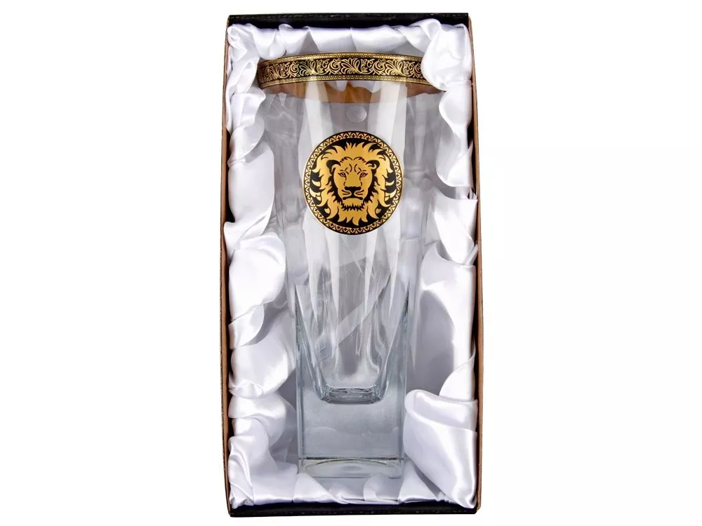 Ваза с изображением льва станет отличным украшением интерьера. Ваза выполнена из высококачественного прозрачного хрусталя с окантовкой из золотистого орнамента. В комплекте прилагается подарочная упаковка.