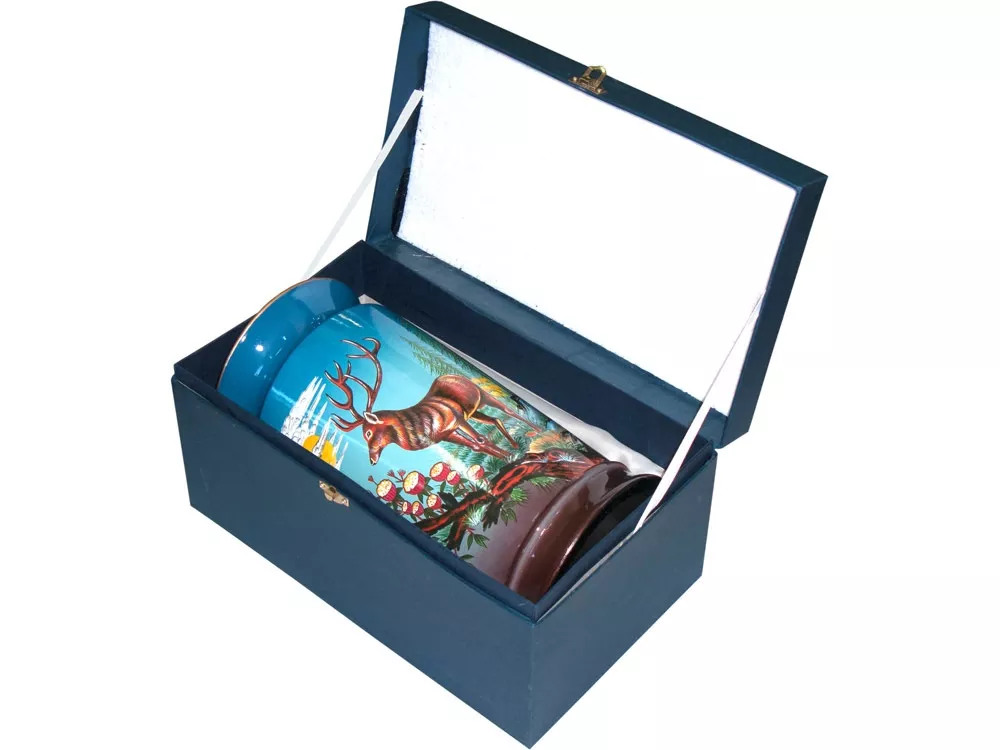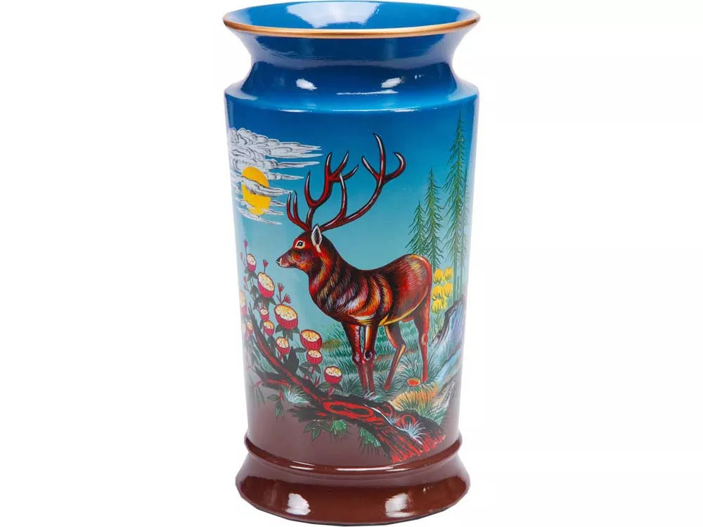 Необычная керамическая ваза с изображением оленя прекрасно подойдет в роли подарка не только женщинам, но и мужчинам, любящим охоту. Ваза покрыта яркими красками. В комплекте прилагается подарочный футляр.