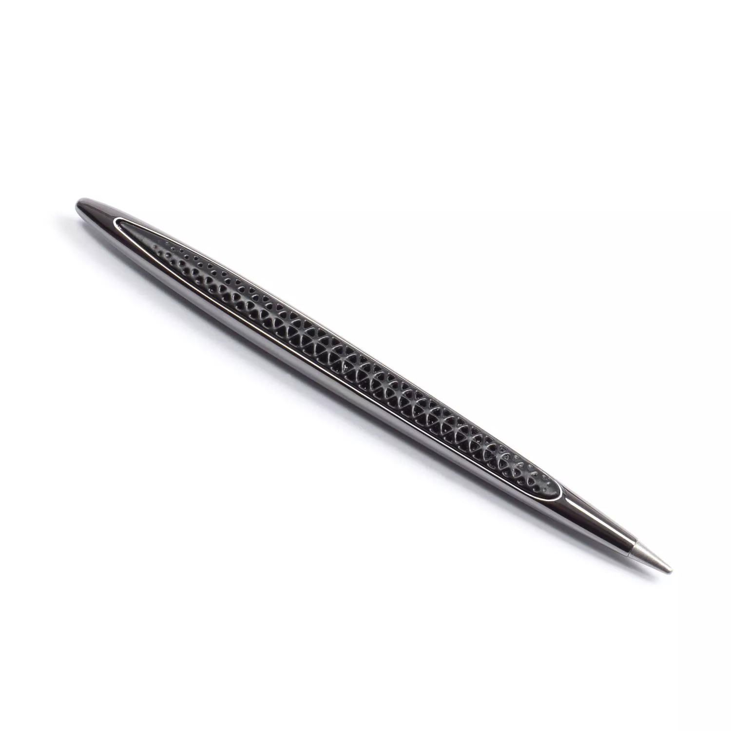 Культовая ручка Pininfarina Cambiano приобретает новый облик благодаря наклонной подставке, напоминающей скульптуру. Ее динамичная форма, кажется, бросает вызов силе тяжести, создавая эффектное сценическое положение благодаря игре с равновесием. Черный блестящий корпус ручки также выглядит по-новому: на вставках нанесена 3D-печать из расплавленного нейлонового порошка, создающая трехмерный гибкий объект. Перфорированная текстура напоминает архитектурный контекст и является “фишкой” всей коллекции Transition. Вечная ручка имеет необычный пишущий узел в виде наконечника Ethergraf, который изготовлен из сплава металлов по запатентованной технологии. Он не содержит свинец и алюминий, производится вручную итальянскими мастерами и практически не расходуется за десятилетия использования. При соприкосновении с поверхностью бумаги, происходит химическая реакция и наконечник оставляет серебристый след, который напоминает цвет графитового карандаша, но обладает большей стойкостью. Корпус ручки выполнен из алюминия. Вес ручки 39 гр, длина 16 см, диаметр 1 см. Подставка черная матовая из анодированного алюминия. Набор упакован в большую подарочную коробку.