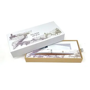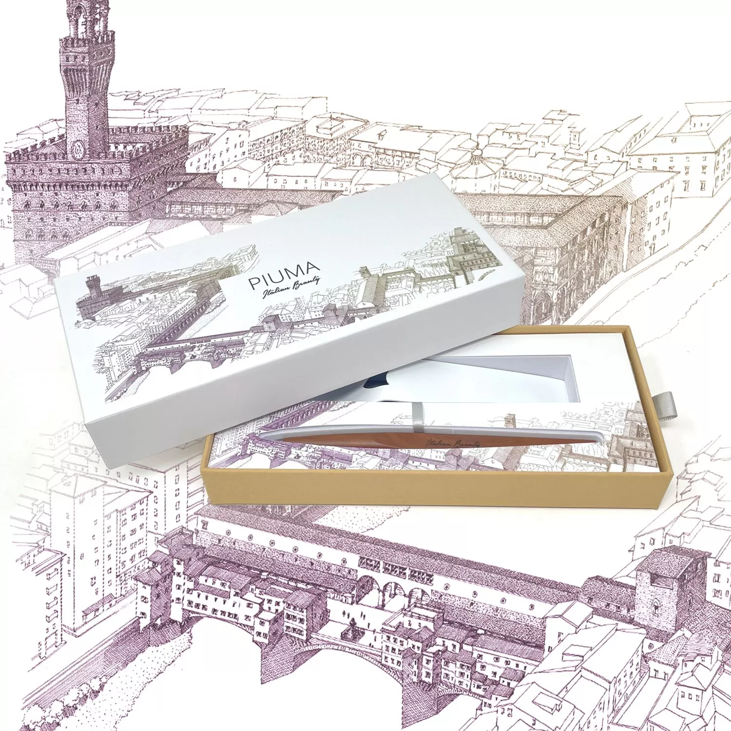 Вечная ручка Pininfarina Piuma Флоренция из лимитированной коллекции дизайнеров Pininfarina в сотрудничестве с Francesco Corni Foundation, посвященной красоте Италии и представленной 8 городами. Франческо Корни - выдающийся дизайнер из Модены, посвятивший свою жизнь популяризации истории и архитектуры. Используя трехмерное перспективное видение, он изучает наиболее значимые здания каждого города, выбирает наилучшую точку обзора, чтобы подчеркнуть их особенности, и прорисовывает детали в древней технике калиграфии. Дополняет видение мастера умелое использование цветов, по одному для каждого города. Для Флоренции дизайнер выбрал центром композиции Corridoio Vasariano, идущий от Palazzo Vecchio до Palazzo Pitti, и фиолетовый цвет, в результате подарочная коробка c ручкой Pininfarina PIUMA становится произведением искусства. PIUMA - ручка динамической формы в виде гусиного пера. Дизайнеры вдохновлялись Кодексом о полете птиц мастера Леонардо да Винчи, целью которого было понять тайну полета и который хранится сейчас в Королевской библиотеке Турина. Piuma находится в постоянном равновесии со своим центром тяжести благодаря белому стальному пьедесталу. Вечная ручка имеет необычный пишущий узел в виде наконечника Ethergraf®, изготовленного из сплава металлов по запатентованной технологии. Он не содержит свинец и алюминий, производится вручную итальянскими мастерами и практически не расходуется за десятилетия использования. При соприкосновении с поверхностью бумаги, происходит химическая реакция и наконечник оставляет серебристый след, который напоминает цвет графитового карандаша, но обладает большей стойкостью. Идеально пишет на каменной бумаге. На ручке стильный логотип Italian Beauty, она полностью сделана из дерева груши. Набор упакован в белую подарочную коробку.