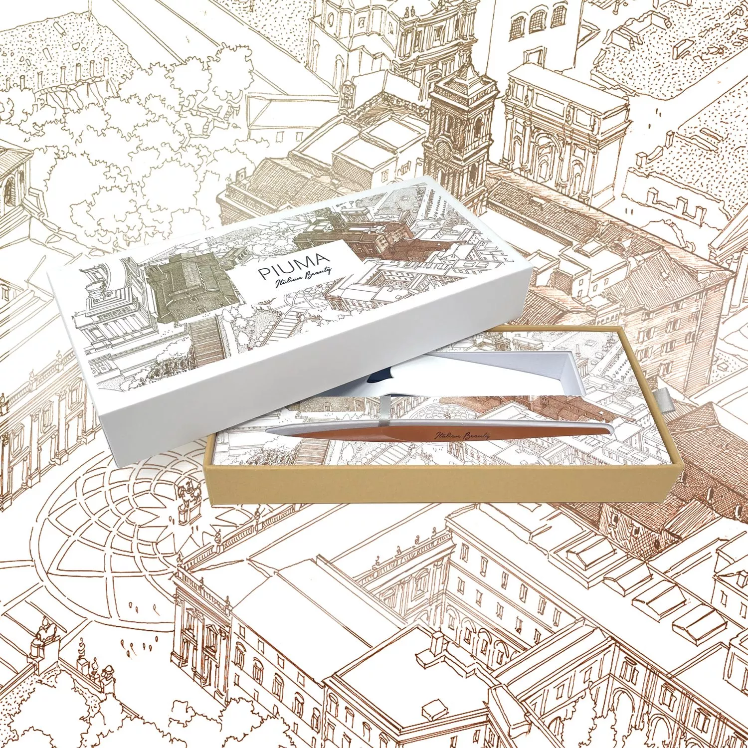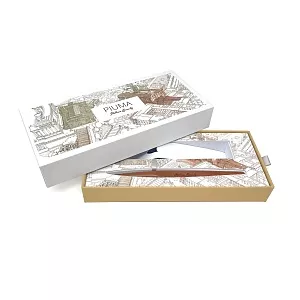 Вечная ручка Pininfarina Piuma Рим из лимитированной коллекции дизайнеров Pininfarina в сотрудничестве с Francesco Corni Foundation, посвященной красоте Италии и представленной 8 городами. Франческо Корни - выдающийся дизайнер из Модены, посвятивший свою жизнь популяризации истории и архитектуры. Используя трехмерное перспективное видение, он изучает наиболее значимые здания каждого города, выбирает наилучшую точку обзора, чтобы подчеркнуть их особенности, и прорисовывает детали в древней технике калиграфии. Дополняет видение мастера умелое использование цветов, по одному для каждого города.Для Рима дизайнер выбрал центральной точкой площадь Piazza del Campidoglio и коричневый цвет, в результате подарочная коробка c ручкой Pininfarina PIUMA становится произведением искусства. PIUMA - ручка динамической формы в виде гусиного пера. Дизайнеры вдохновлялись Кодексом о полете птиц мастера Леонардо да Винчи, целью которого было понять тайну полета и который хранится сейчас в Королевской библиотеке Турина. Piuma находится в постоянном равновесии со своим центром тяжести благодаря белому стальному пьедесталу. Вечная ручка имеет необычный пишущий узел в виде наконечника Ethergraf®, изготовленного из сплава металлов по запатентованной технологии. Он не содержит свинец и алюминий, производится вручную итальянскими мастерами и практически не расходуется за десятилетия использования. При соприкосновении с поверхностью бумаги, происходит химическая реакция и наконечник оставляет серебристый след, который напоминает цвет графитового карандаша, но обладает большей стойкостью. Идеально пишет на каменной бумаге. На ручке стильный логотип Italian Beauty, она полностью сделана из дерева груши. Набор упакован в белую подарочную коробку.