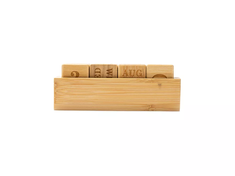 Вечный настольный календарь из бамбука, состоящий из одной подставки и четырех блоков с гравировкой.