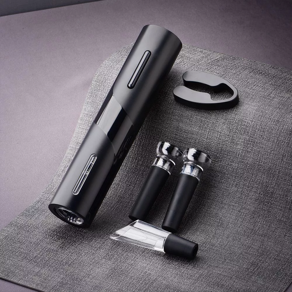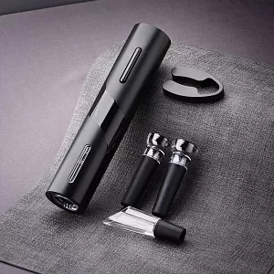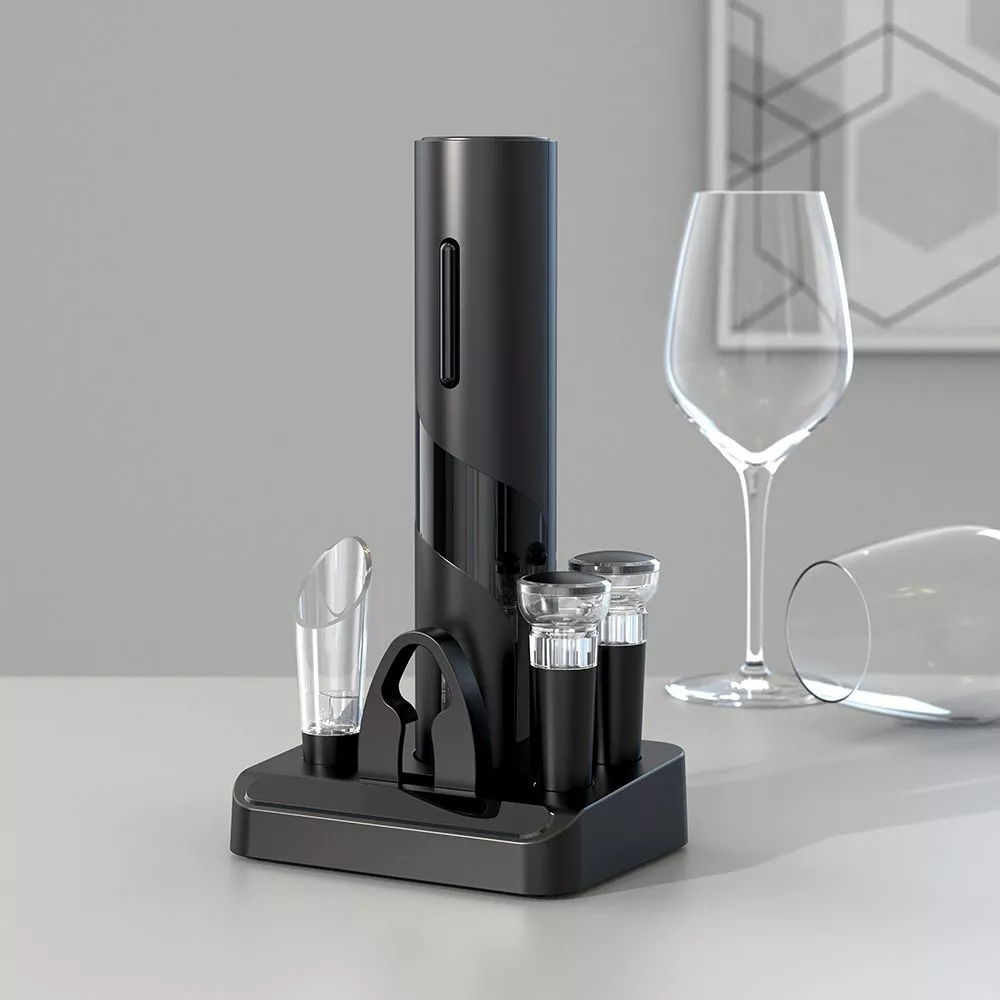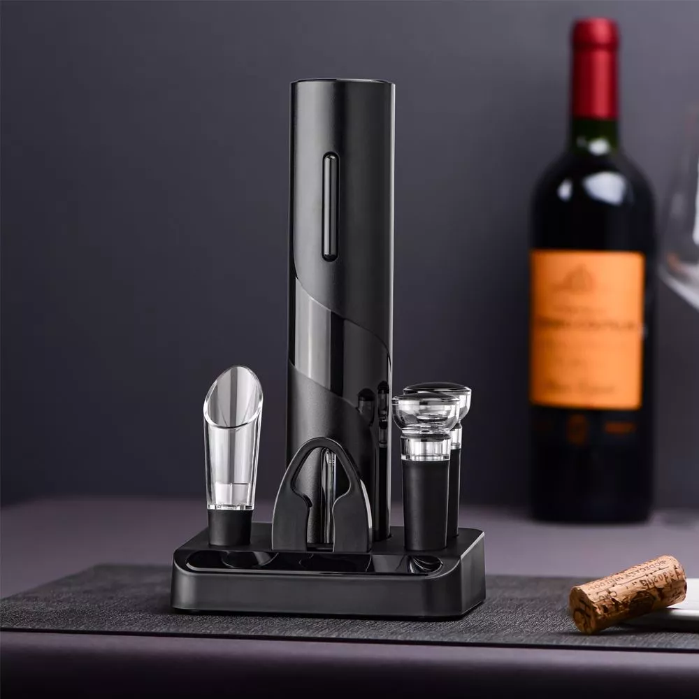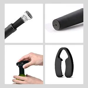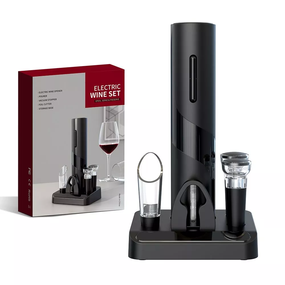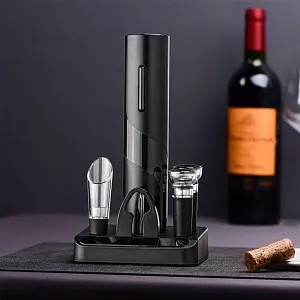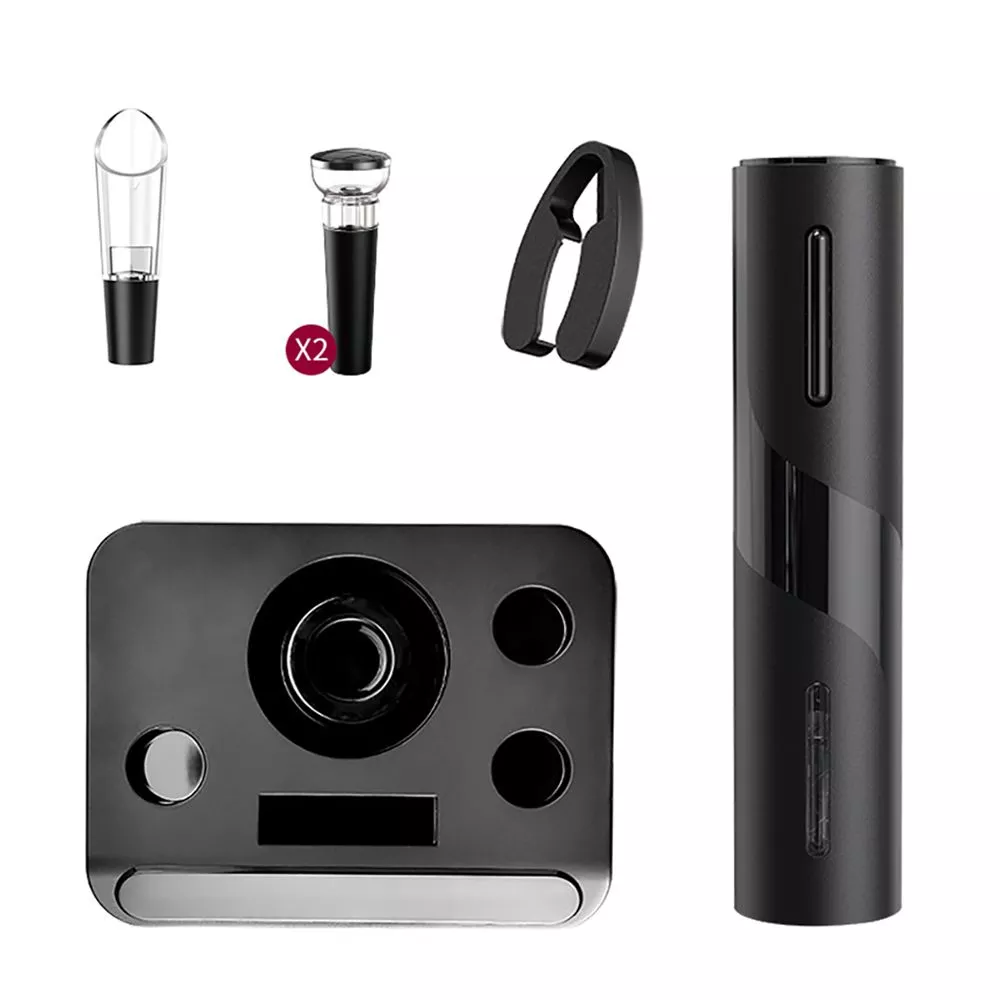 В наборе имеется все необходимое: электрический штопор (не перезаряжаемый), нож для фольги, вакуумная пробка, воронка-аэратор для вина (батарейки типа АА в комплект не входят) Все компоненты набора для удобства размещаются на специальной подставке-органайзере.
