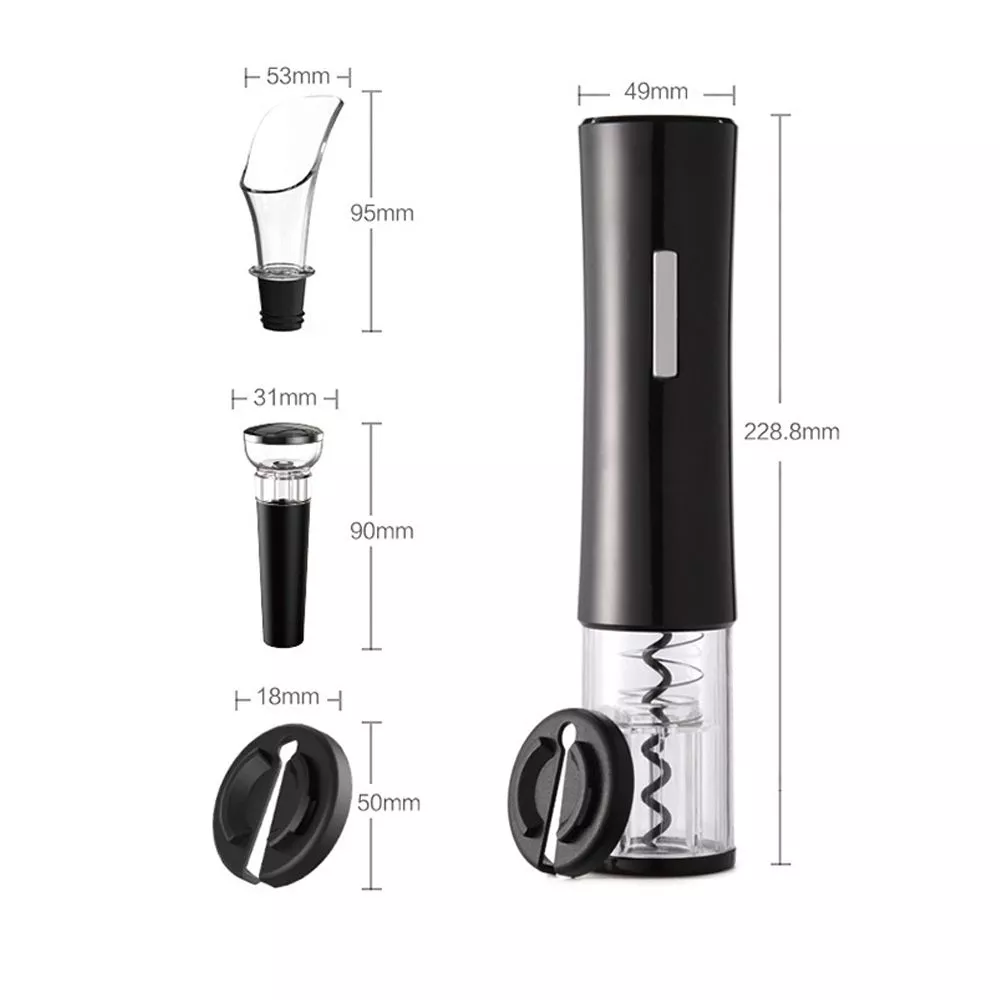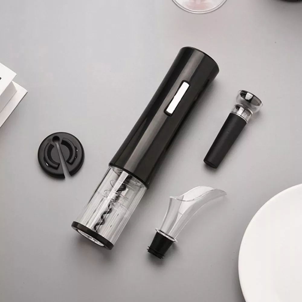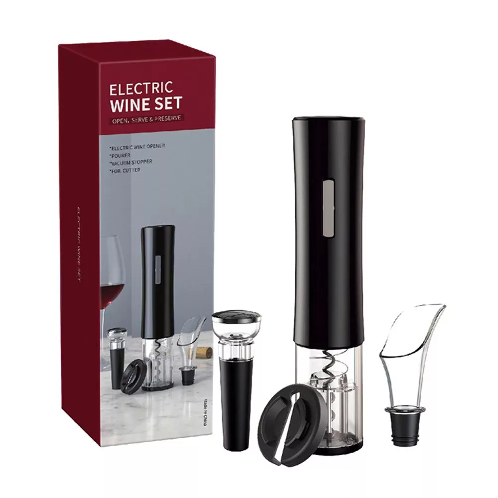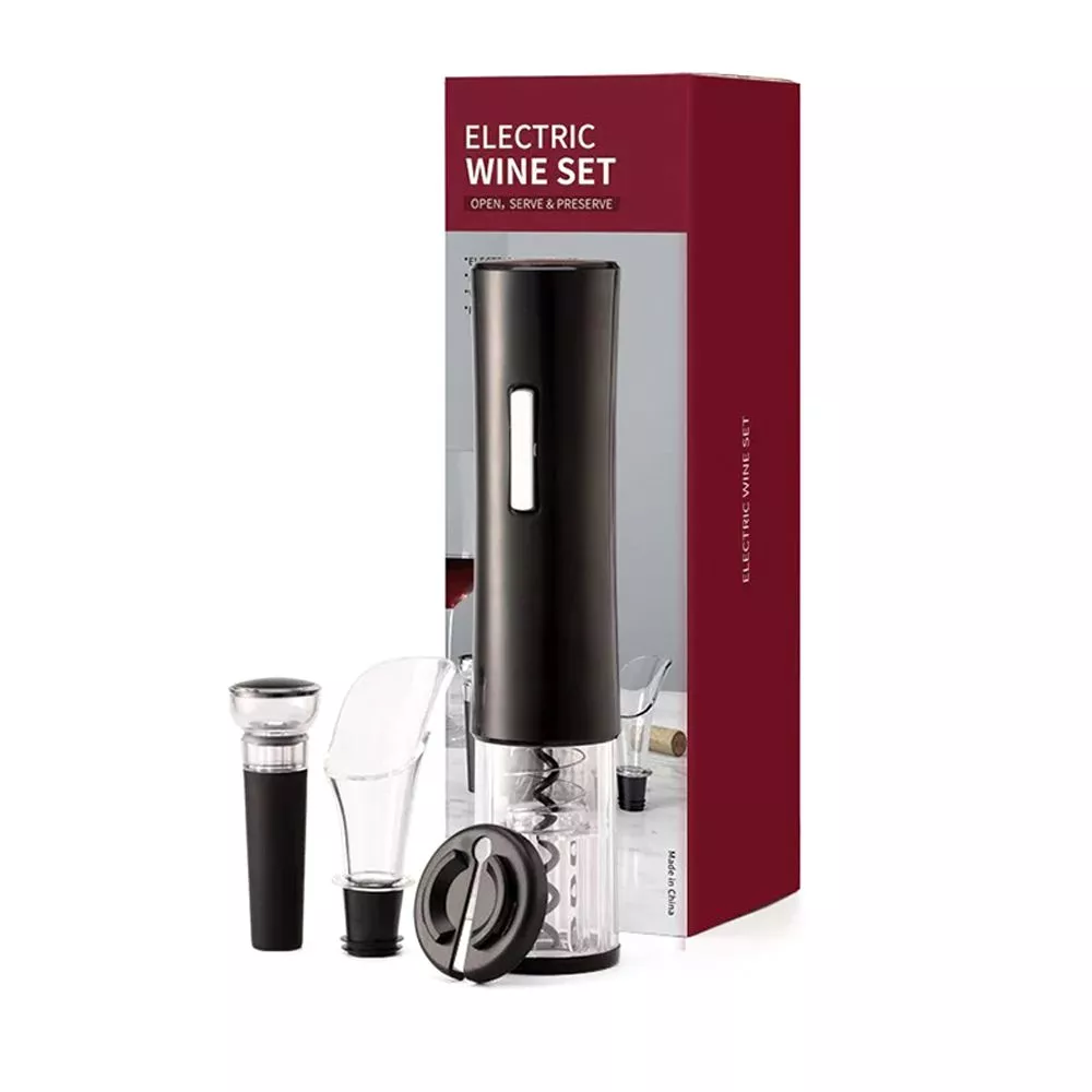 Винный набор включает электрический штопор, нож для фольги, вакуумную пробку для вина, воронку-аэратор.