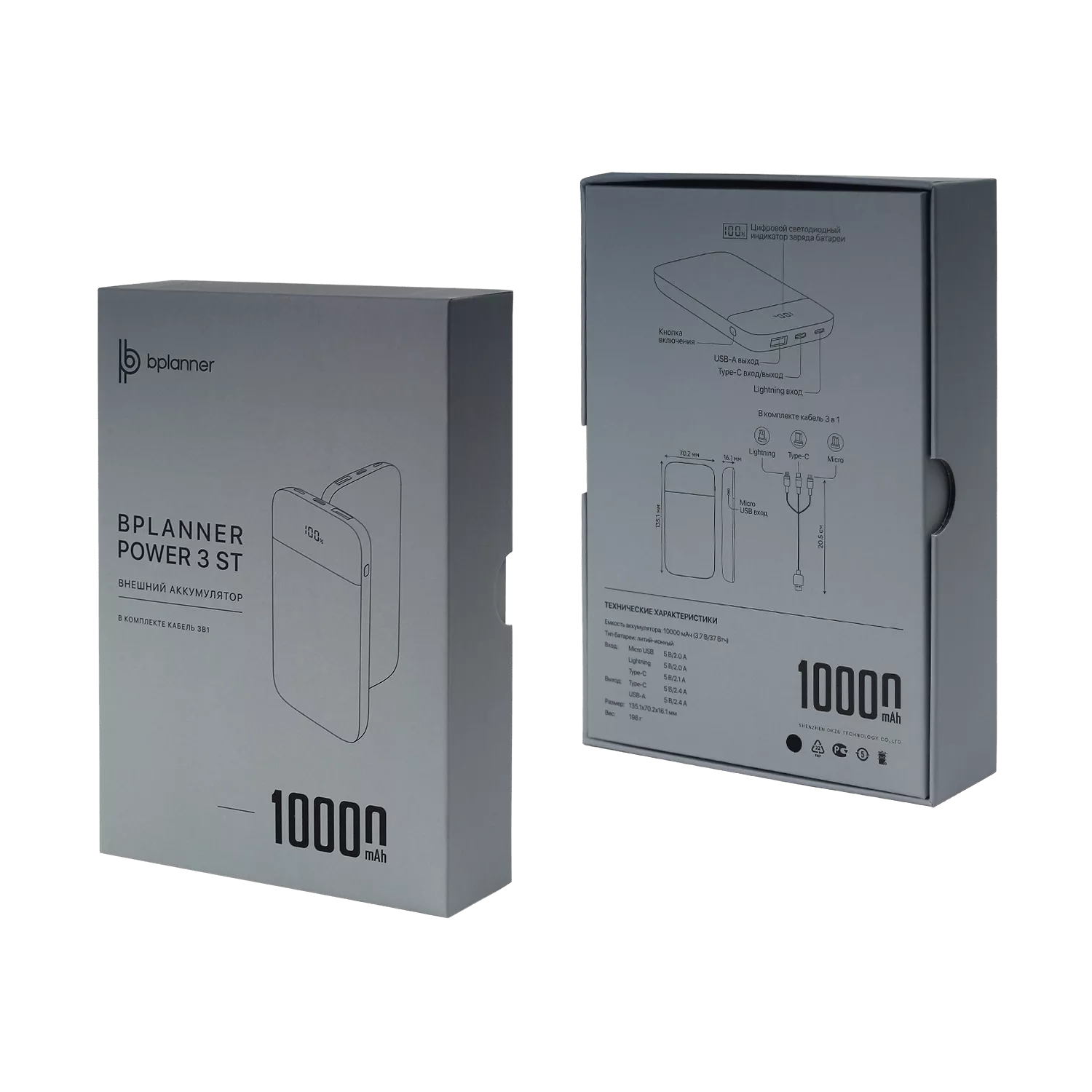 Внешний софт-тач аккумулятор Bplanner Power 3ST емкостью 10000 mAh оснащен цифровым индикатором заряда. Дизайн аккумулятора дополняет черный дисплей заряда на передней панели устройства. Внешний аккумулятор оснащен входом Type С, Micro-USB и Lightning, что упрощает процесс его зарядки. В комплекте идет кабель 3 в 1 и инструкция. Комбинируется с ежедневниками Bplanner 1, Bplanner 2, Bplanner 4 ,а также ручками с софт-тач покрытием.
