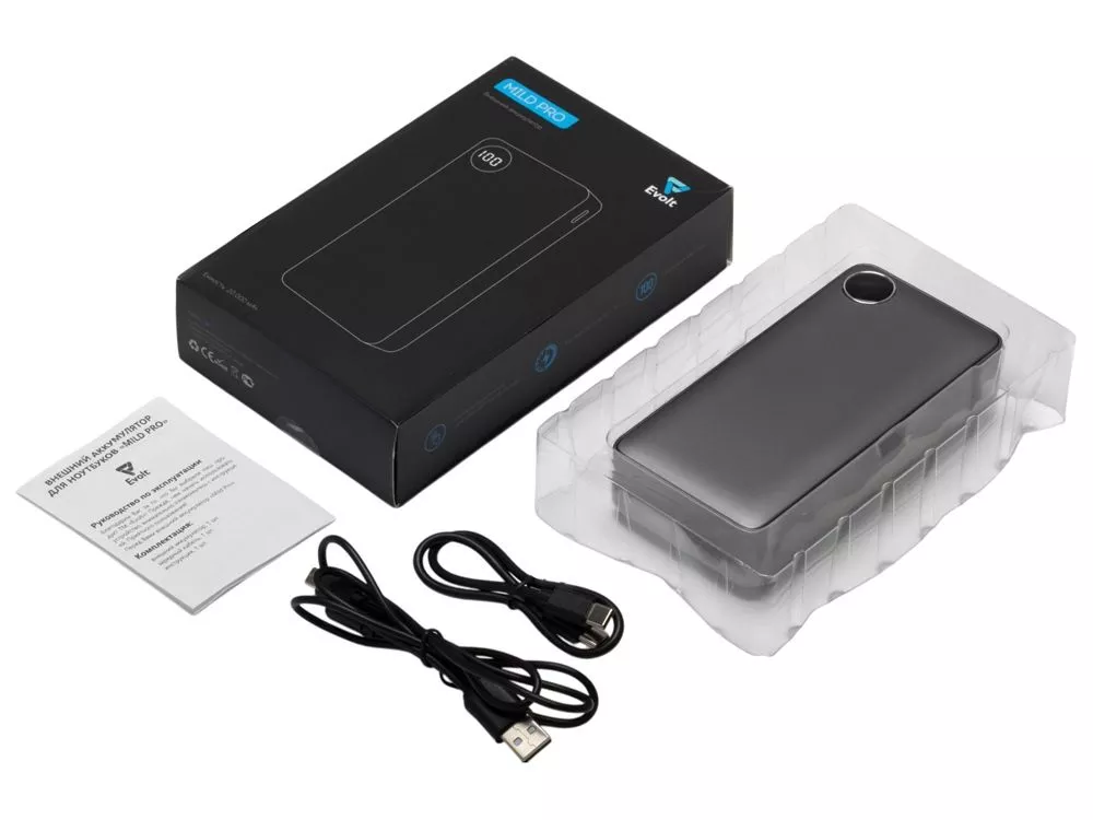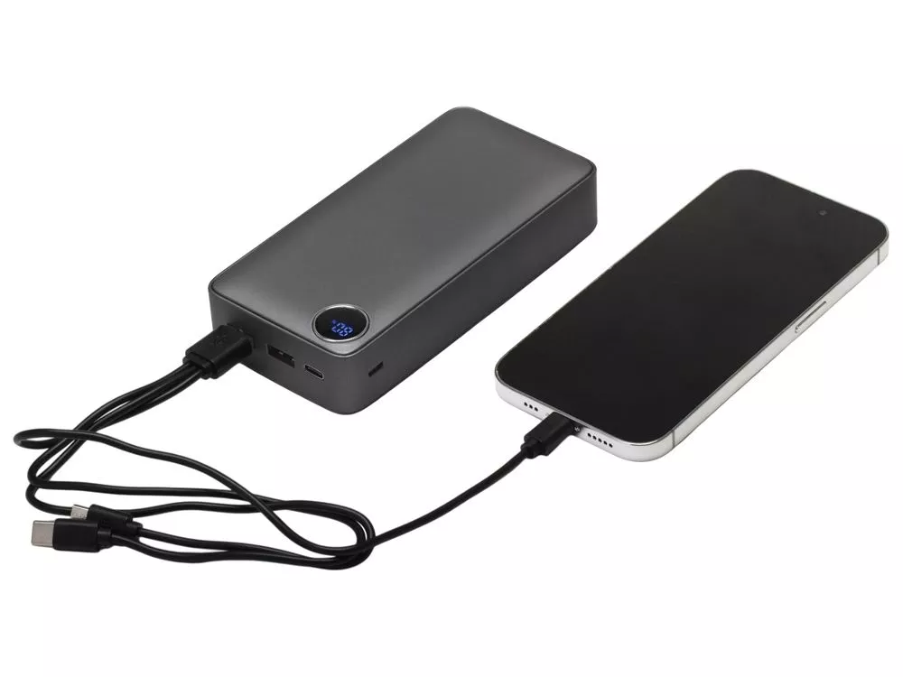 Внешний аккумулятор с новым покрытием металлик soft-touch и цифровым дисплеем. Приятное бархатистое покрытие дополнено эффектом металлического блеска. Обе стороны можно украсить полноцветным УФ изображением. Ёмкости 20000 мАч хватает для зарядки смартфона, планшета, наушников и других гаджетов на всю неделю и больше. Поддержка быстрой зарядки устройств и 3 выходных порта подойдет современному человеку, так как никто не любит ждать. На фронтальной части расположен цифровой дисплей, показывающий текущий заряд аккумулятора в процентах. Функция быстрой зарядки будет отображаться на дисплее зелеными буквами PD (Power Delivery). При первом включении дисплей может отставать от реального заряда аккумулятора, но после первого же цикла разрядки-зарядки повербанка он настроится автоматически. Имеется 3 выходных разъема (USB-A * 2, USB-C) и 2 входных (USB-C, micro USB). Кабель с поддержкой быстрой зарядки (USB-C - USB-C) и универсальный кабель 3-в-1 в комплекте (Lightning, micro USB, USB-C). Можно брать в самолёт. • уникальное покрытие металлик soft-touch • цифровой дисплей уровня заряда • 3 выходных разъема (USB-A * 2, USB-C) и 2 входных (USB-C, micro USB) • кабель быстрой зарядки (USB-C) и универсальный 3-в-1 в комплекте • большой запас заряда 20000мач: для поездок или обладателей нескольких гаджетов УФ-печать (УФ-печать цветные изделия) на данный товар осуществляется бесплатно. Оплачивается только настройка оборудования в размере 2000 рублей на весь тираж.