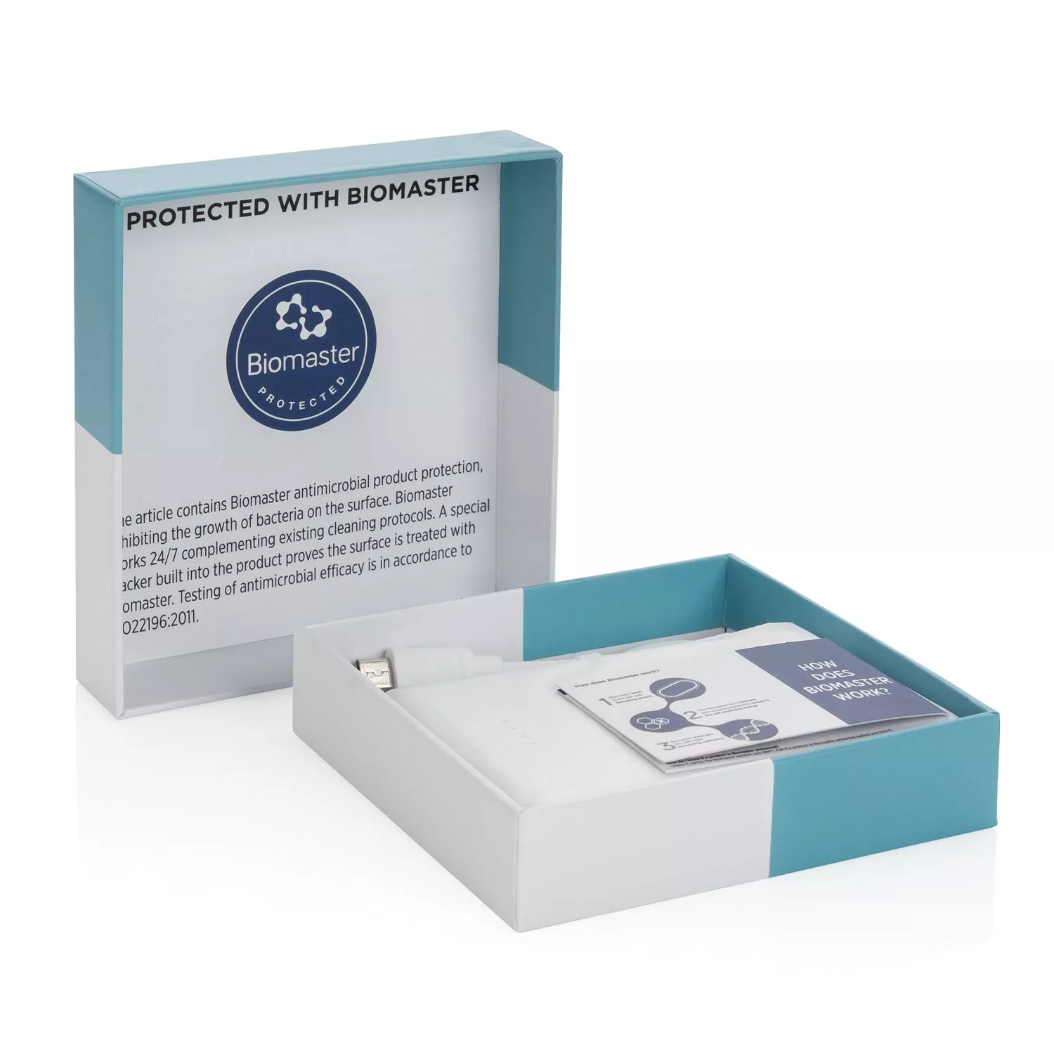 Внешний аккумулятор карманного размера на 5000 мАч сделан из ABS-пластика с добавлением антимикробного агента Biomaster, который обеспечивает дополнительную защиту от вредоносных бактерий. Антимикробный агент находится в материале изделия, а не только на поверхности, поэтому эффективность защитных свойств с течением времени не изменится. Товар протестирован в соответствии с международным стандартом антибактериальной эффективности ISO 22196, на 100% безопасен для пользователей. Кроме того, наличие антимикробного агента Biomaster не влияет на пригодность материала для вторичного использования. Изделие содержит уникальный индикатор Verimaster, позволяющий доказать наличие Biomaster в составе материала, в то время как большинство аналогичных изделий на рынке не могут подтвердить заявленные антимикробные свойства. Устройство оснащено литий-полимерным аккумулятором класса А емкостью 5000 мАч, позволяющим зарядить смартфон до 3 раз. Вход micro USB: 5 В / 2 А; 2 порта USB с выходом: 5 В / 2 А
