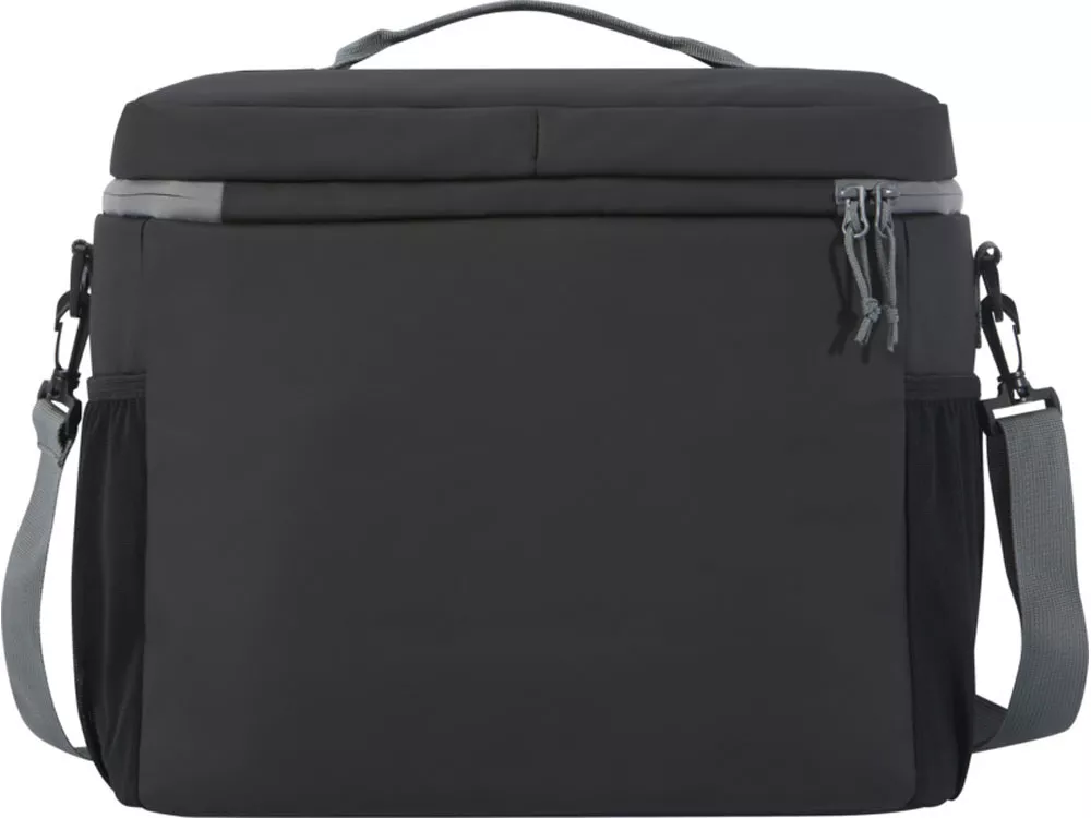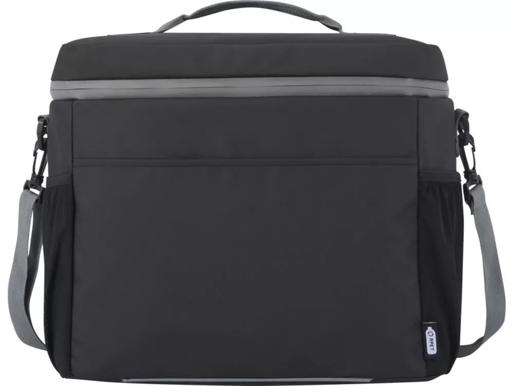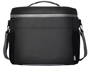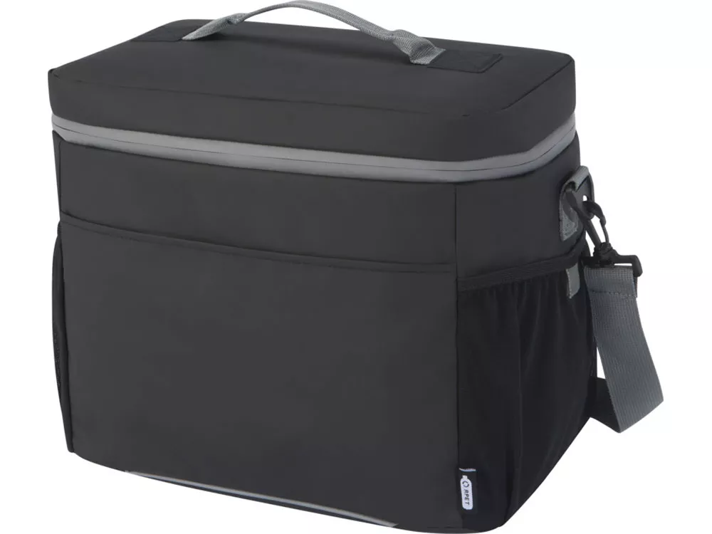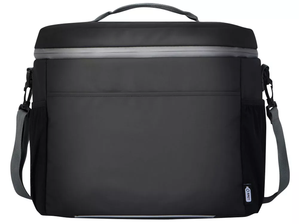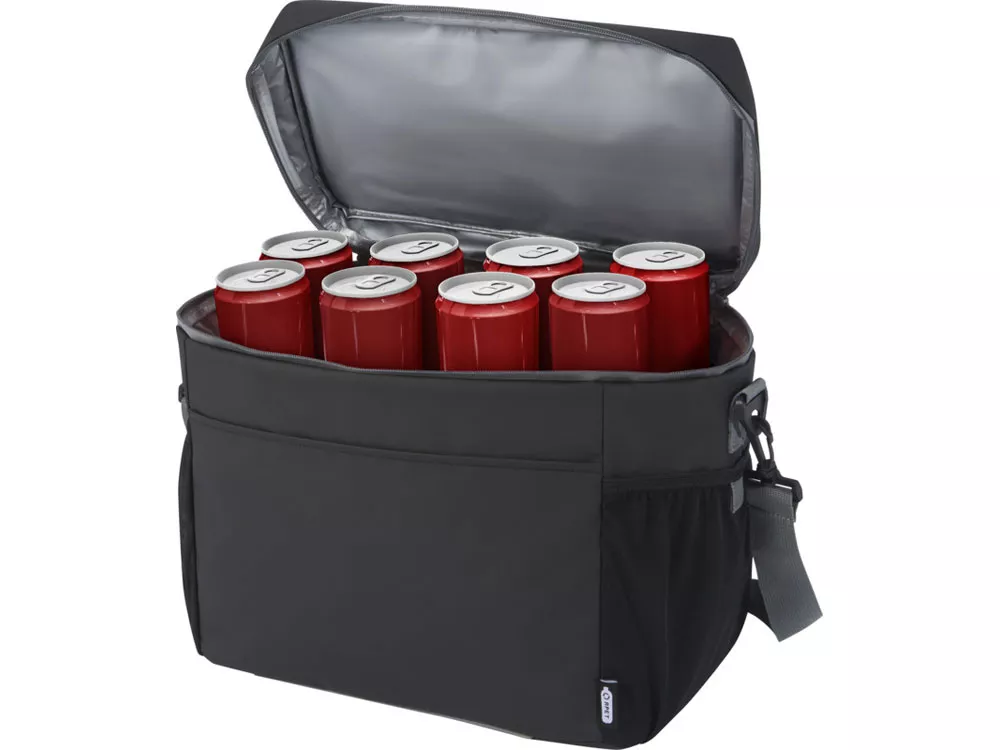 Водонепроницаемая сумка-холодильник на 20 банок, изготовленная из переработанных материалов, сертифицированных согласно стандарту GRS, включая молнии. Имеет просторное отделение на молнии с подкладкой из безопасного для пищевых продуктов и очень толстого теплового PEVA высокой плотности и пенной изоляцией, позволяющей хранить напитки и закуски холодными в течение нескольких часов. Также имеет 2 сетчатых кармана и один открытый передний карман как дополнительное место для хранения. Тканевая ручка для переноски и регулируемый плечевой ремень с мягкой подкладкой обеспечивают удобное ношение. Из переработанных материалов, сертифицированных по стандарту GRS, изготовлены основная ткань, подкладка, лямки и застежки-молнии. Емкость: 22 литра. Не содержит ПВХ.