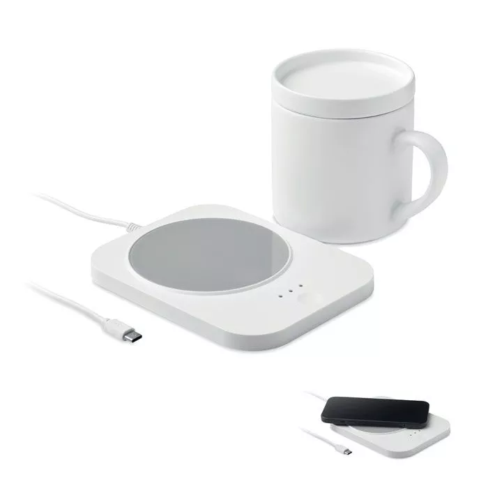 2 in 1 wireless charger 15W and mug warmer device in ABS. With ceramic mug with lid. Capacity: 250 ml. Keep drinks warm to a max of 50ºC. 3 temperature settings with touch screen. USB connection cable. Output: DC 9V/1.67A (15W).