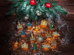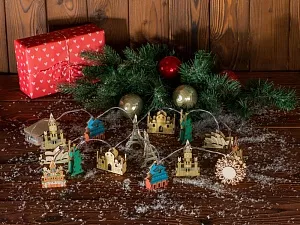 Новогодняя ёлочная гирлянда постоянного свечения с цветными фигурками достопримечательностей из натуральной березовой фанеры в подарочной коробке сделает процесс украшения ёлки или дома не только увлекательным, но и познавательным! Гирлянда состоит из 7 парных фигурок достопримечательностей и центрального элемента в виде снежинки. Снежинка и корпус батарейного блока имеют дополнительные съемные панели, которые поставляются в наборе в виде отдельных деталей и крепятся на изделие на двусторонний скотч. Эти элементы, а также подарочная коробка из экологически чистой фанеры, специально предназначены для нанесения и придания презенту уникальности. Гирлянда работает от 2-х батареек АА, которые входят в комплект. Гравировка (CO2 лазер) (Без чернения) на данный товар осуществляется бесплатно. Оплачивается только настройка оборудования в размере 950 рублей на весь тираж.