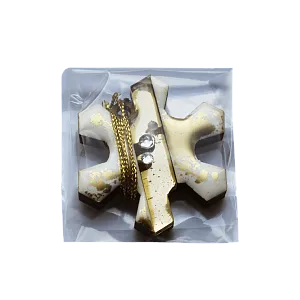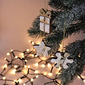 Игрушка выполнена в современной технике с использованием классических новогодних цветов. Она станет замечательным украшением елки и прекрасным дополнением к корпоративному подарку. В украшении используется дерево, акрил и смола.