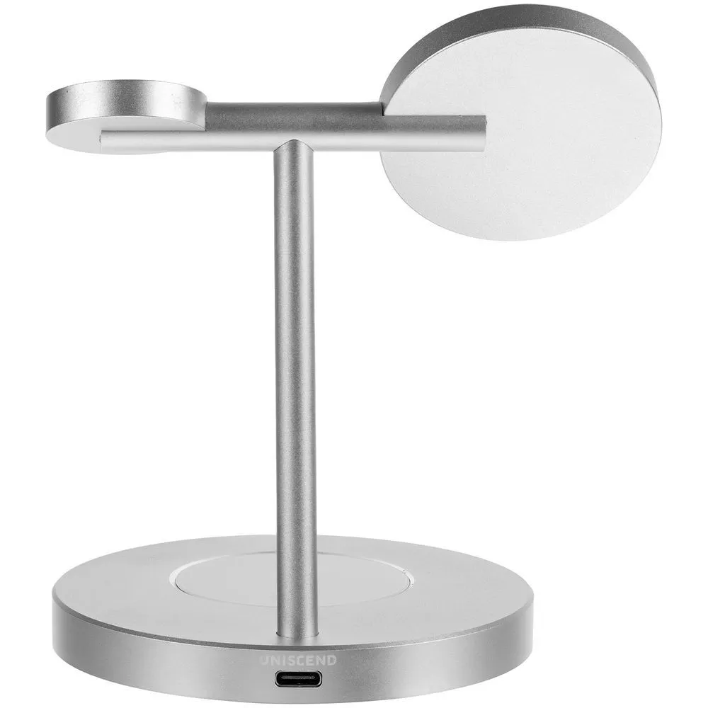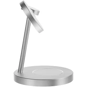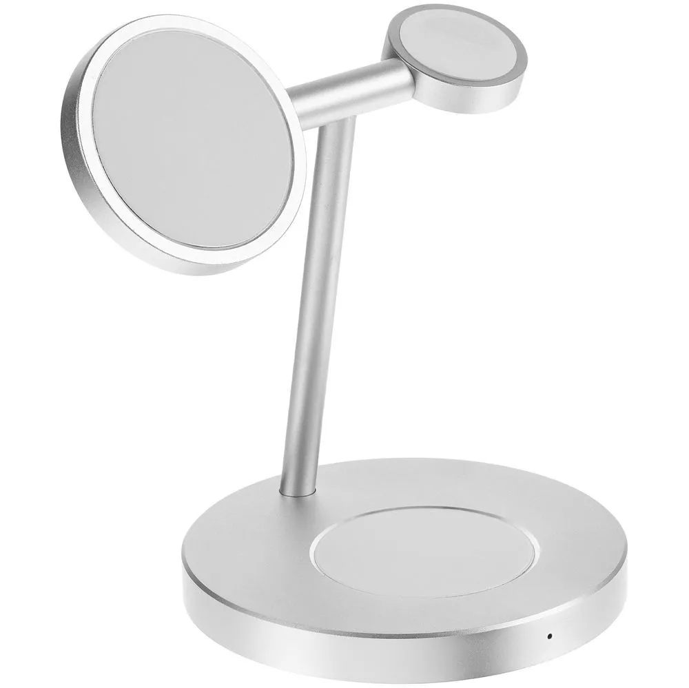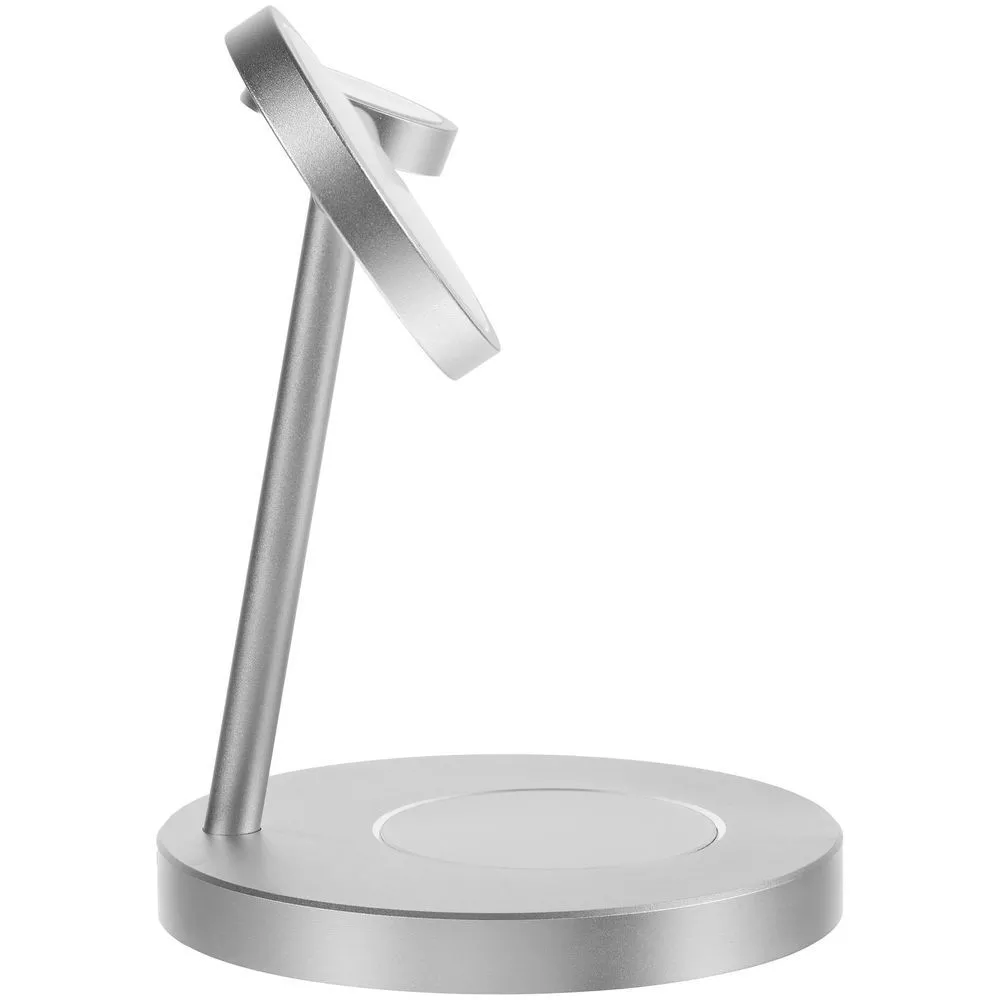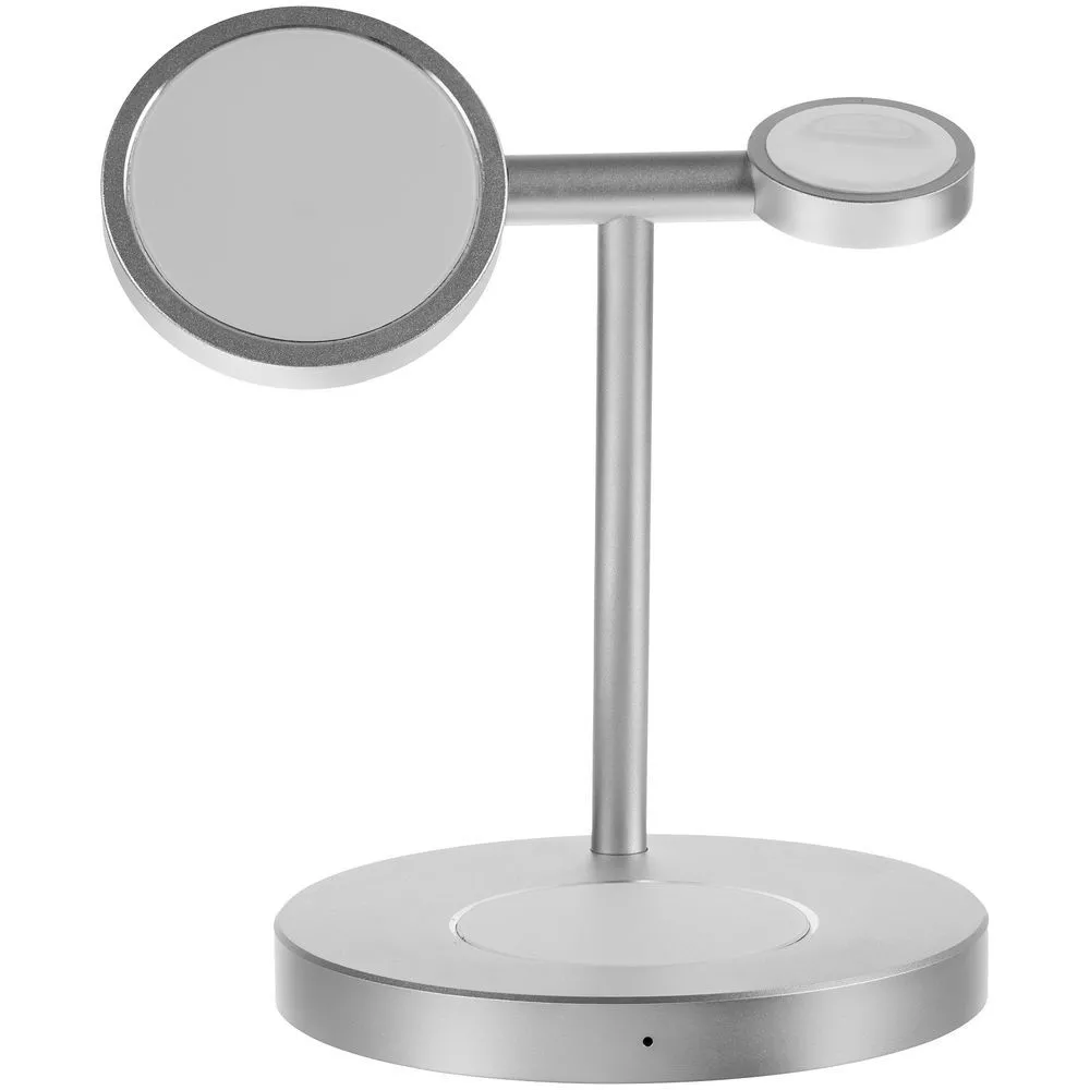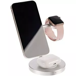 Станция может заряжать одновременно 3 устройства: беспроводные наушники с соответствующей функцией беспроводного заряда, смартфон, часы Apple Watch 2–6. Смартфоны iPhone 12–14 удерживаются на станции встроенными в их корпус магнитами. Прочие телефоны необходимо дополнить магнитным стикер-адаптером для надежного удержания на зарядной области.