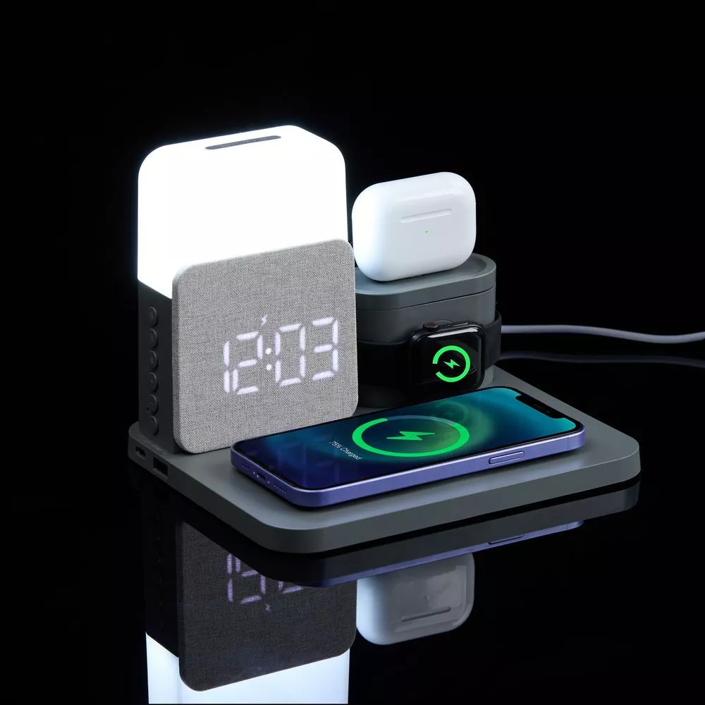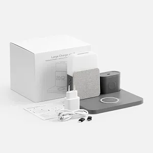 Large Charge — многофункциональное устройство, которое сочетает в себе функции станции для проводной и беспроводной зарядки разнообразных устройств, настольных часов с будильником и лампы.