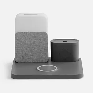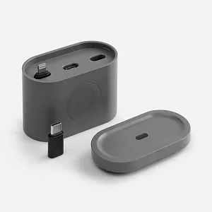 Зарядная станция совместима со всеми смартфонами, поддерживающими технологию беспроводной зарядки Qi. Зарядка начнется автоматически при размещении устройств на индукционной площадке. Компактный бокс рядом с часами служит одновременно и площадкой для беспроводной зарядки часовApple Watch, и док-станцией для зарядки смартфона или наушников через переходник с разъемамиType-C или Lightning. Также можно заряжать устройства через провод, подключив кабель в выходные разъемы USB и USB Type-C. Бокс можно использовать отдельно от основной станции, если подключить его к розетке через его собственный разъем USB.