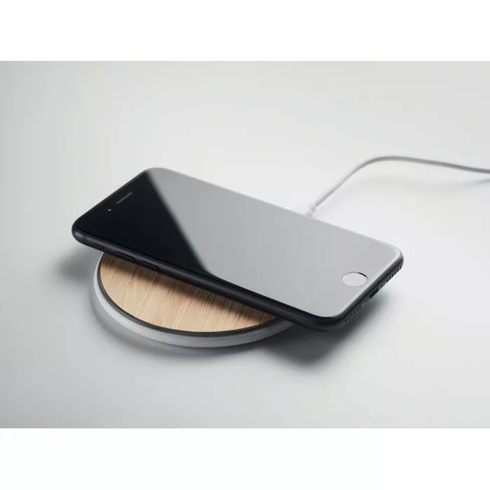 Беспроводное бамбуковое зарядное устройство мощностью 10 Вт с основанием из пластика ABS. Подключите устройство к компьютеру, положите на него смартфон и дайте ему зарядиться. Выход: DC 9V/1.10A (10W) для быстрой зарядки. Совместимо с последними моделями Androids, iPhone® 8, X и более новыми.