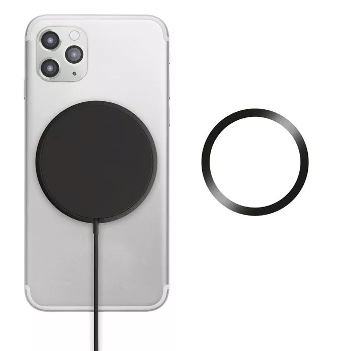 Беспроводное зарядное устройство на магните из ABS. Выход: 9В АС/1,1А(10 Вт) для быстрой зарядки. Совместима с iPhone® 12 и новее. Есть еще доп. магнитное кольцо для б/п зарядки других смартфонов