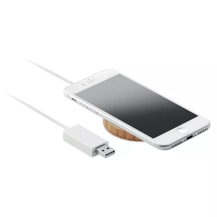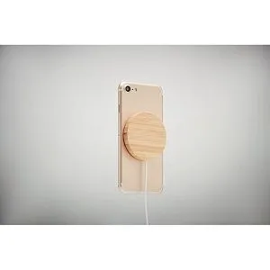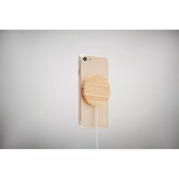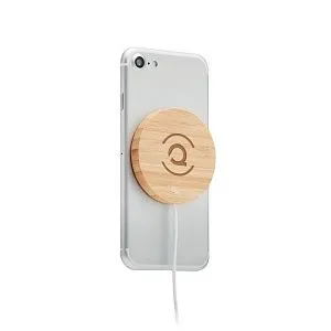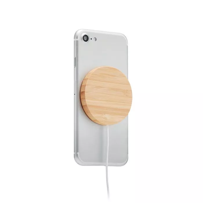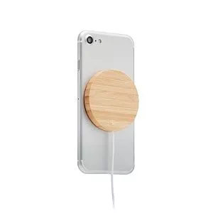 Бамбуковое б/п зарядное устройство с магнитом. Выход: 9В АС/1,1А (10 Вт) для быстрой зарядки. Совместимо с iPhone® 12 и новее. Есть еще доп. магнитное кольцо для б/п зарядки других смартфонов