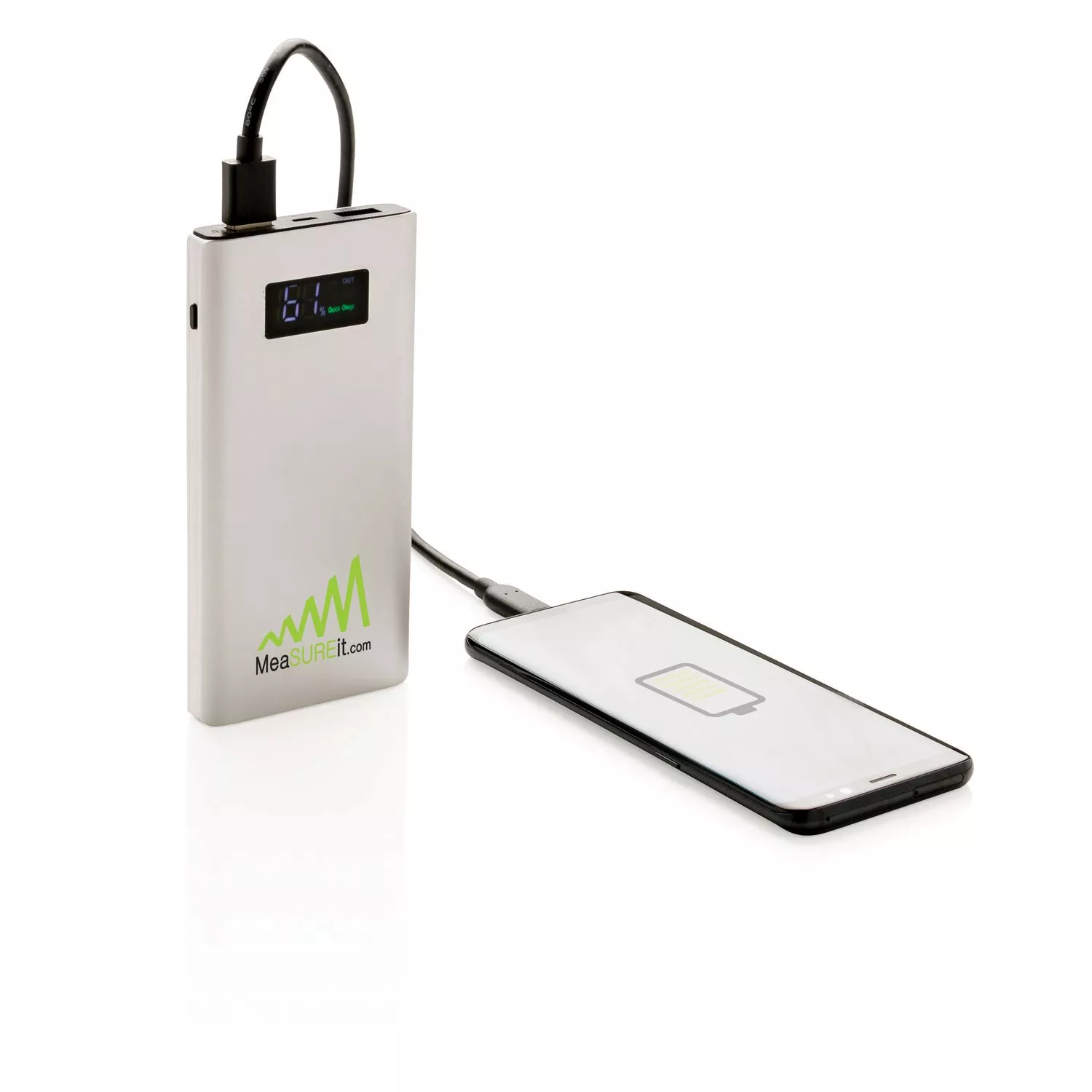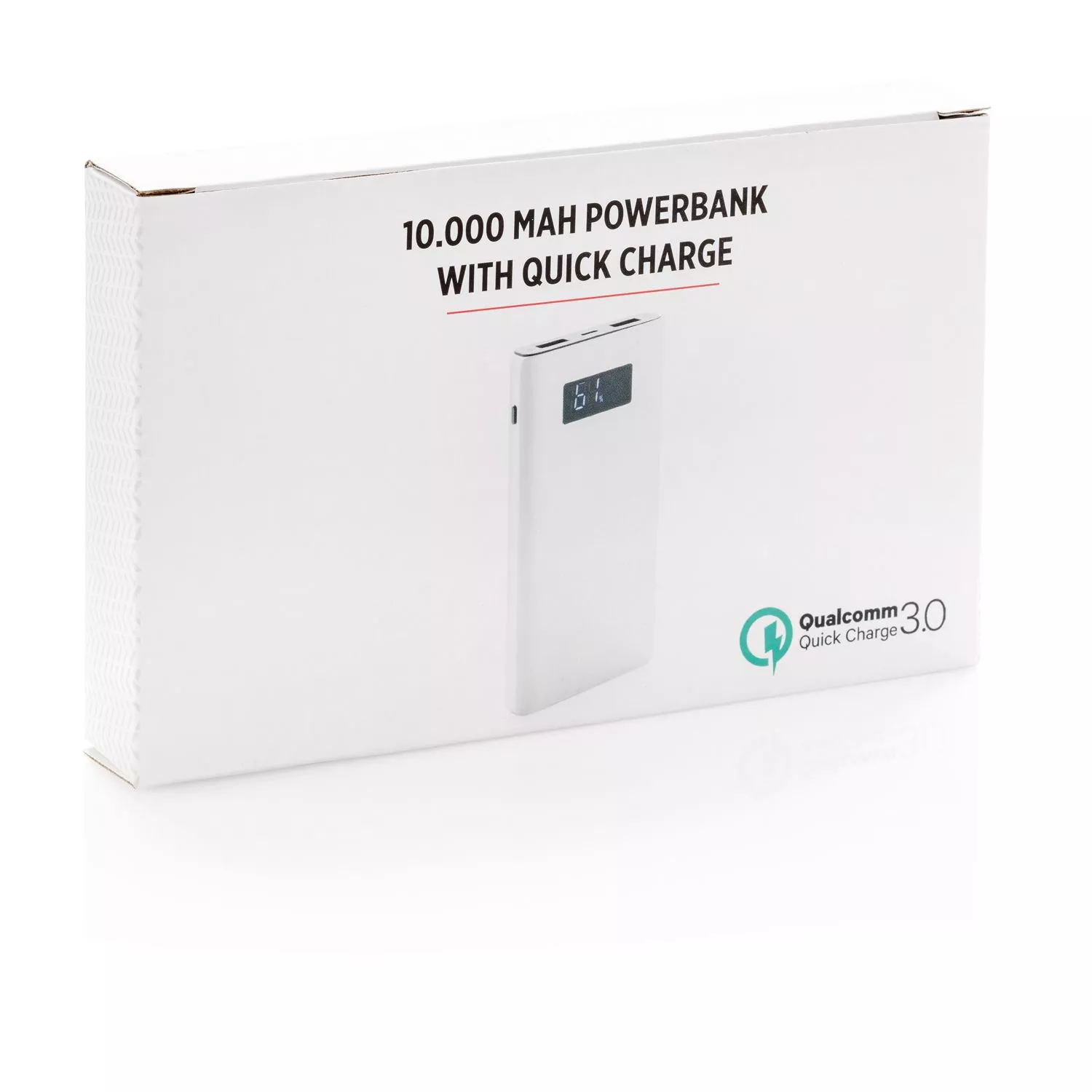 Алюминиевое зарядное устройство с литий-полимерным аккумулятором емкостью 10 000 мАч дополнено удобным LCD-дисплеем, на котором отображается уровень заряда. На устройстве предусмотрено два USB-выхода, один из которых, порт Quick Charge 3.0, предназначен для быстрой зарядки мобильных устройств. Напряжение на выходе - DC 5V/3A, 9V/2A, 12V/1.5A, на входе - 5V/3A. В комплекте идет кабель micro-USB.