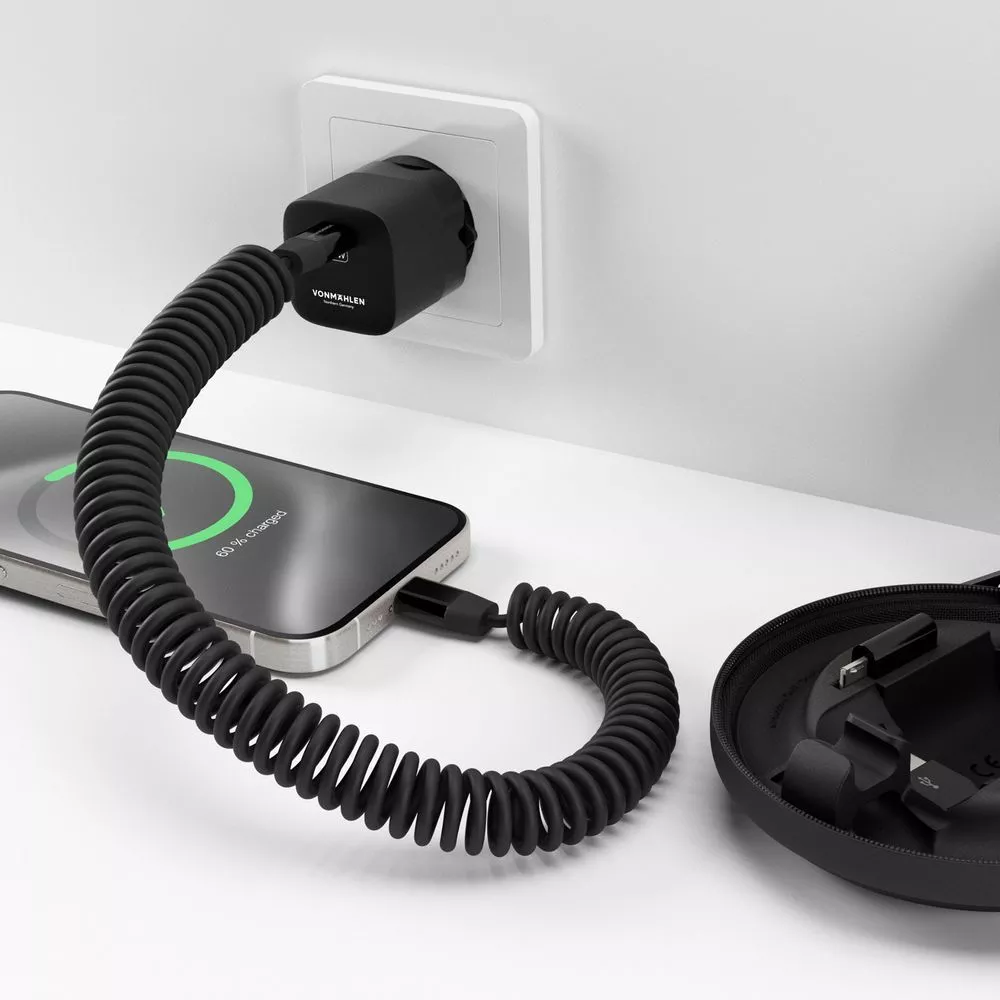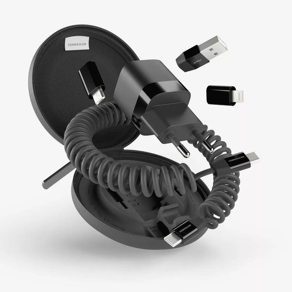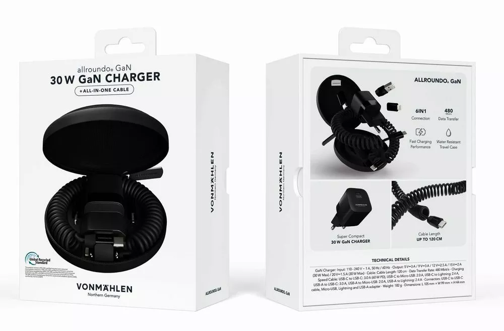 Vonmаhlen Allroundo GaN — это компактный и удобный в использовании аксессуар, сочетающий в себе зарядное устройство мощностью 30 Вт и многофункциональный кабель с переходниками для удобной зарядки самых разных устройств. Комплект переходников позволяет создать до 6 разных конфигураций зарядного кабеля, что делает его по-настоящему универсальным. Это идеальный выбор для тех, кто ищет надежное решение для зарядки и передачи данных не только дома, но и в офисе или в путешествиях.