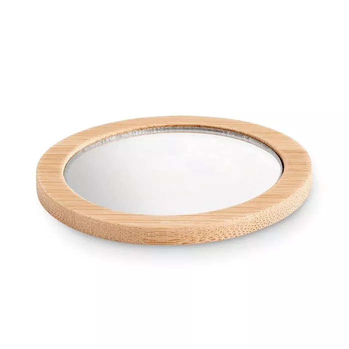 Круглое одностороннее зеркало для макияжа из бамбука. Поставляется в хлопковом мешочке на шнурке.