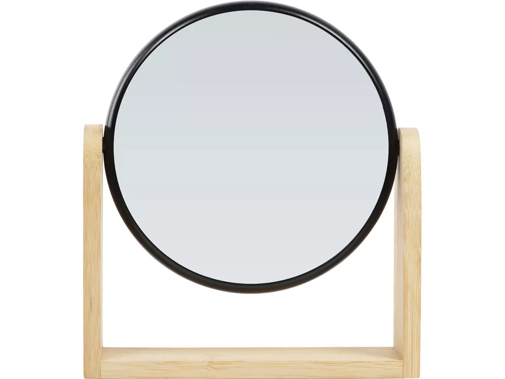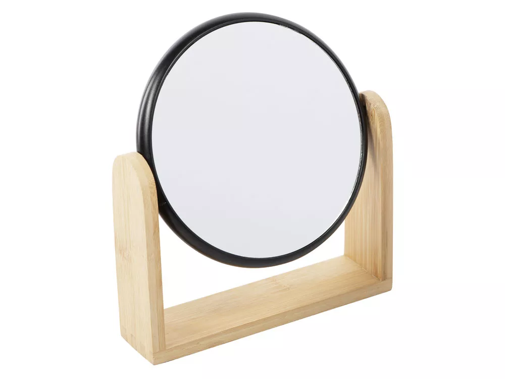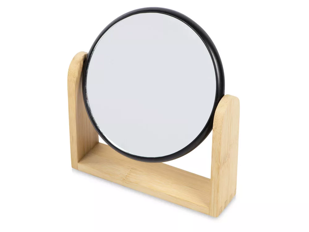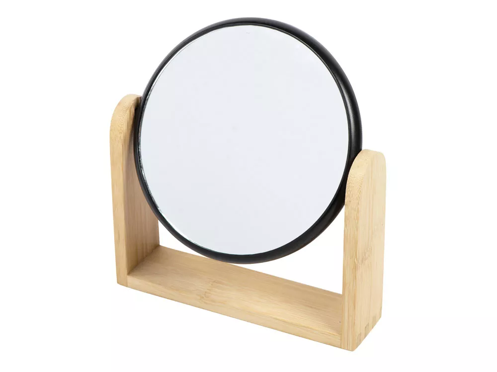 Стильное двустороннее зеркало с бамбуковой подставкой в черной рамке. Одна сторона показывает стандартное отражение, другая - с 2-хкратным увеличением. Гравировка (CO2 лазер) (Без чернения) на данный товар осуществляется бесплатно. Оплачивается только настройка оборудования в размере 950 рублей на весь тираж.