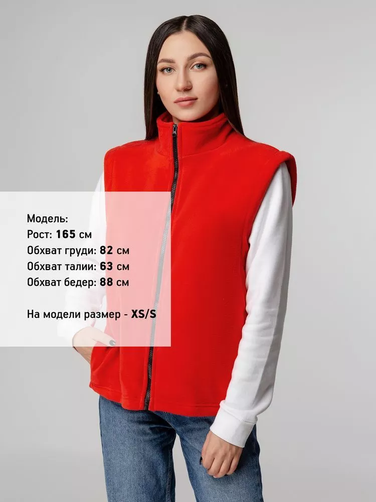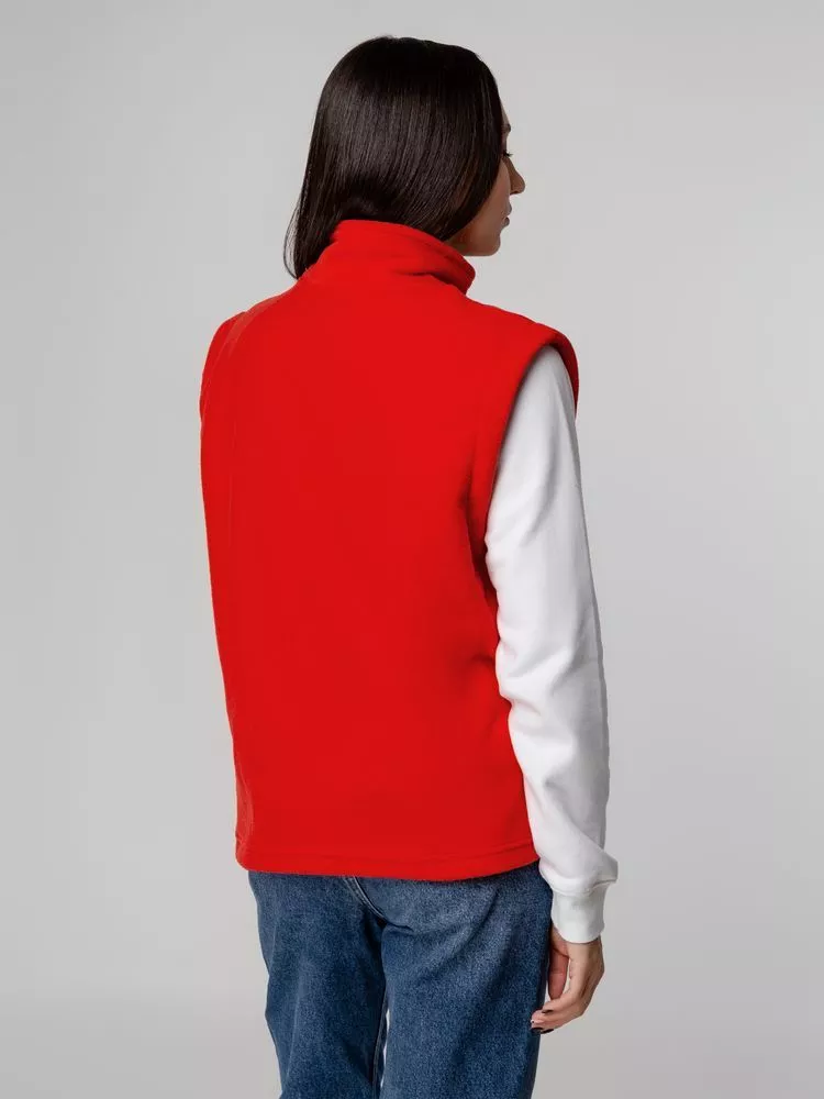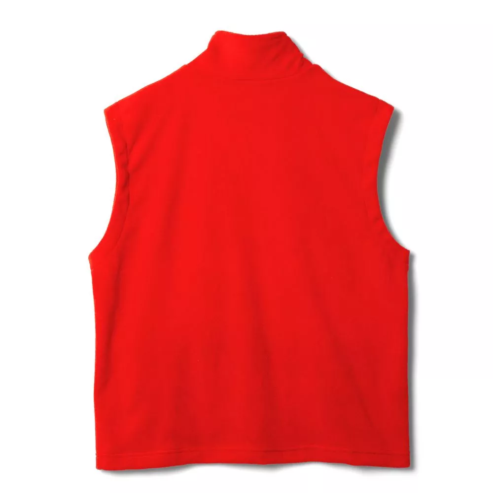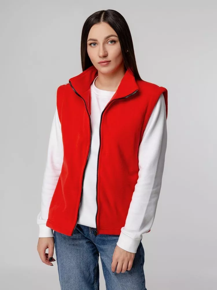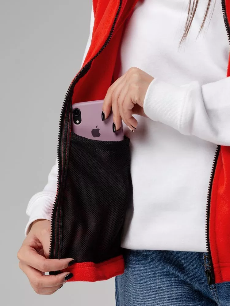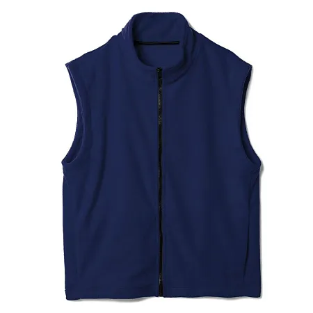 Флисовый жилет унисекс с застежкой-молнией и воротником-стойкой. Укрепляющая тесьма по вороту черного цвета. Два боковых и два внутренних кармана выполнены из сетки.