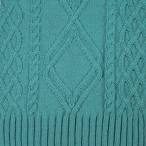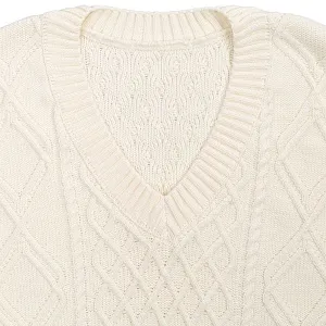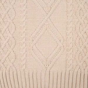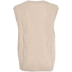 Модель: однотонный жилет крупной вязки с узорами в виде кос. Силуэт оверсайз, спущенное плечо.