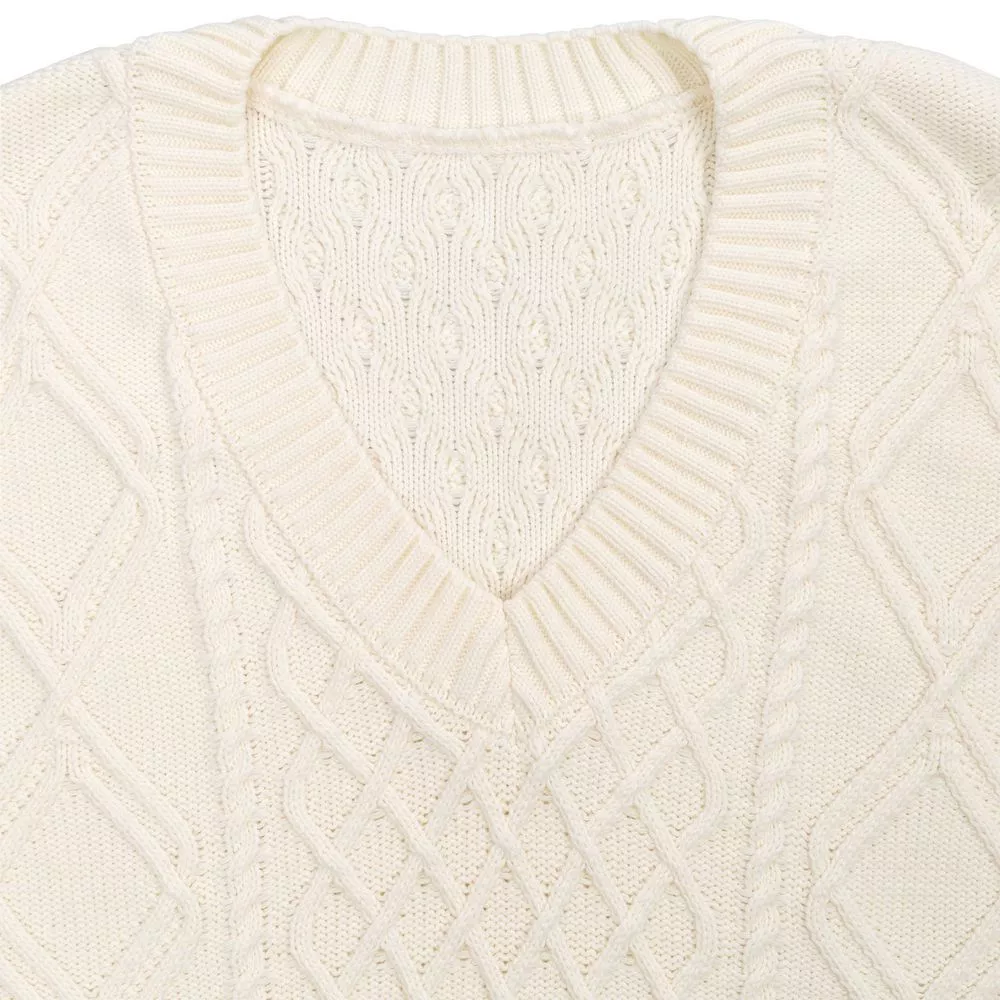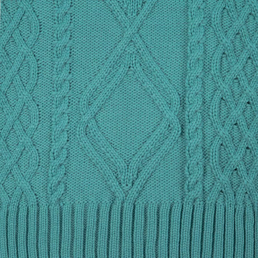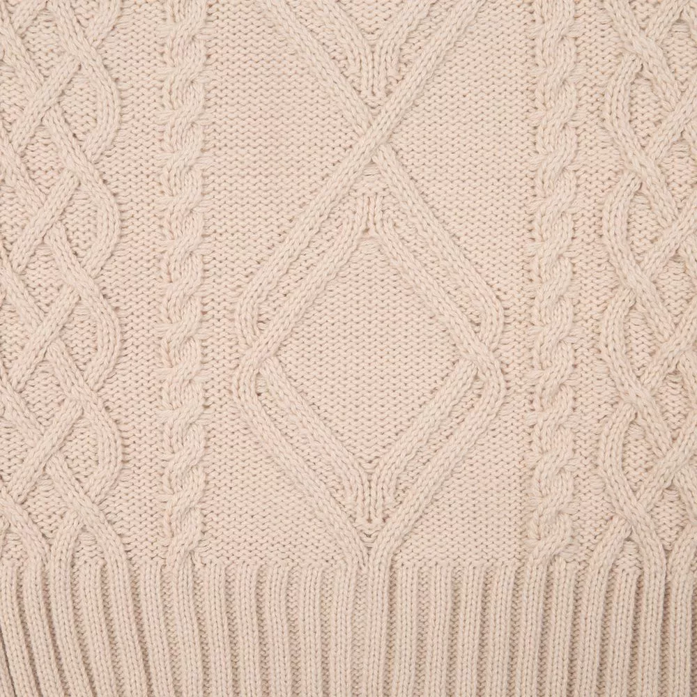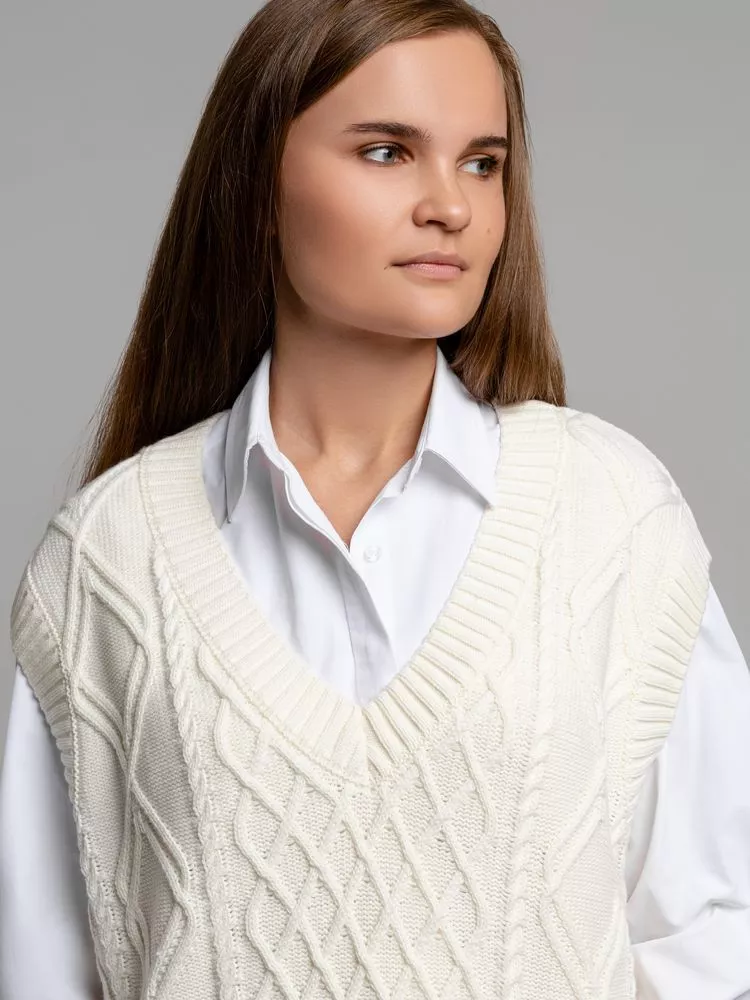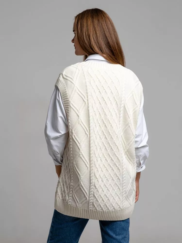 Модель: однотонный жилет крупной вязки с узорами в виде кос. Силуэт оверсайз, спущенное плечо.