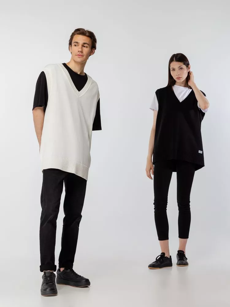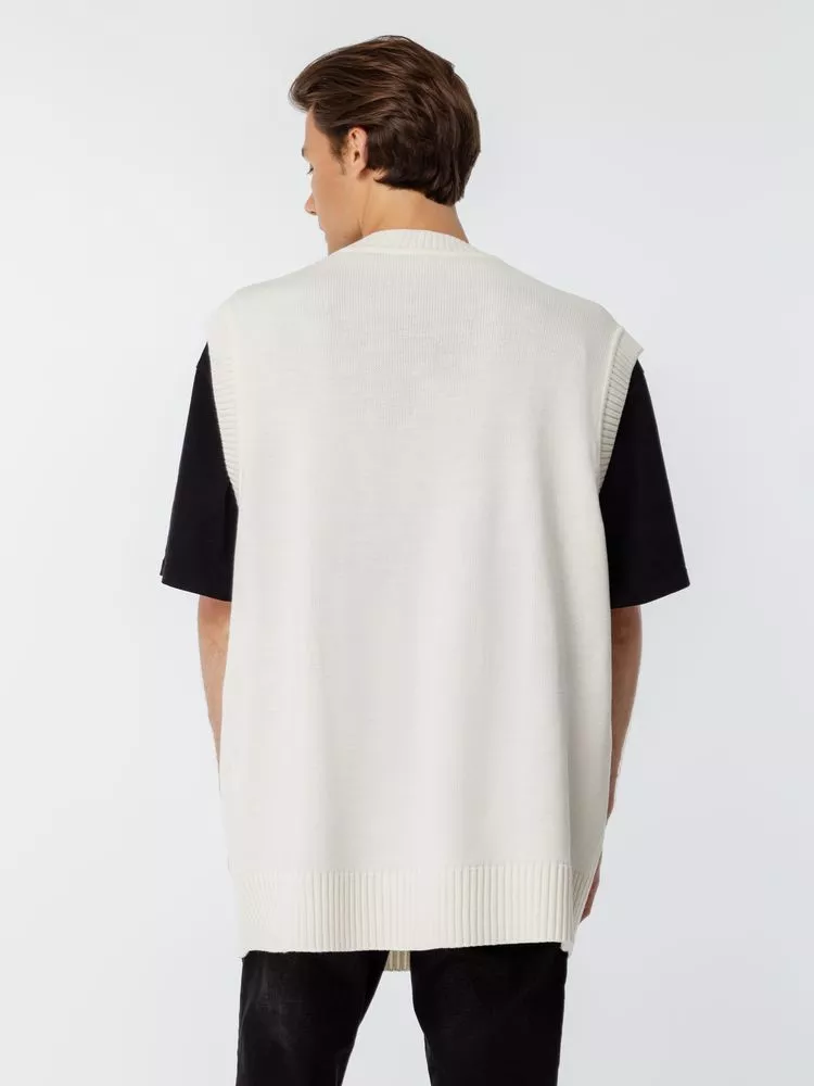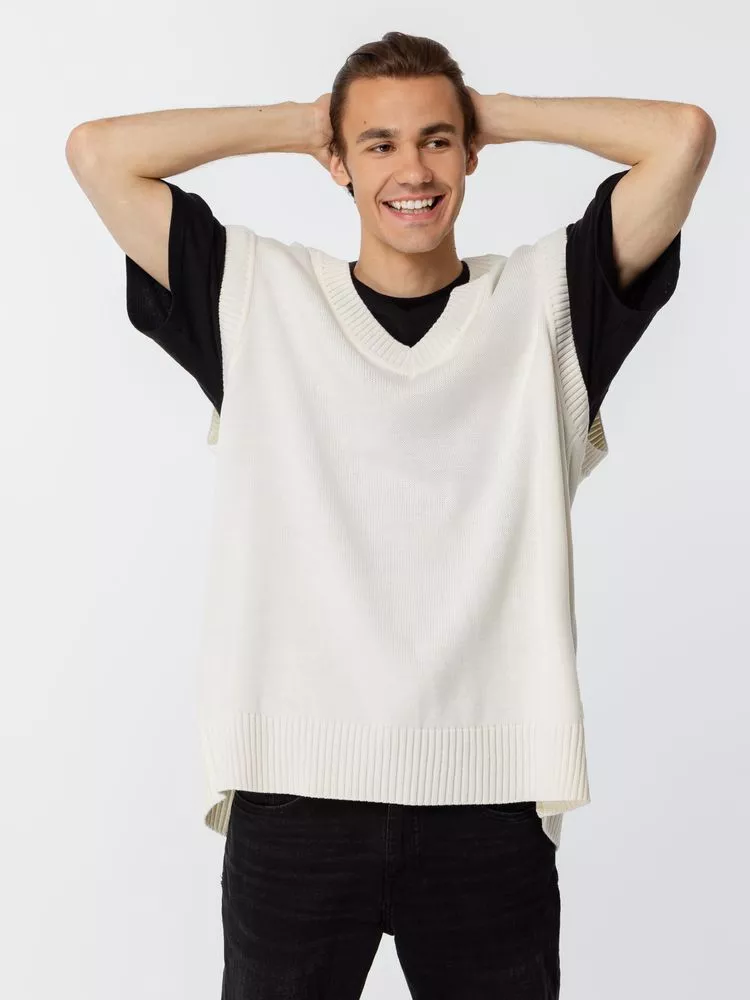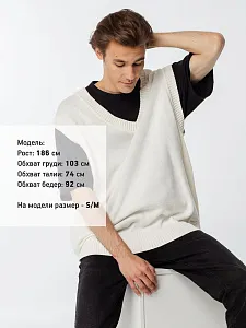Простой по вязке однотонный жилет с посадкой гипероверсайз и широкой резинкой в тон по проймам и вороту станет стильным дополнением к базовой капсуле и порадует любителей максимализма в одежде. Воплощение комфорта и эстетики.