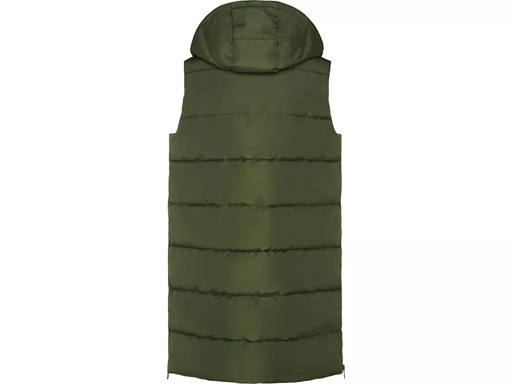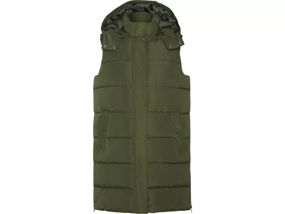 Женский стеганый жилет со съемным капюшоном. · Высокий воротник. · Передняя застежка на молнию и кнопки. · Два кармана на кнопках. · Боковые разрезы продублированы молниями. · Внутренний доступ для нанесения