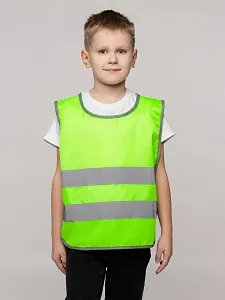 Детский светоотражающий жилет с застежкой-липучкой с одной стороны. Надевается через голову.
