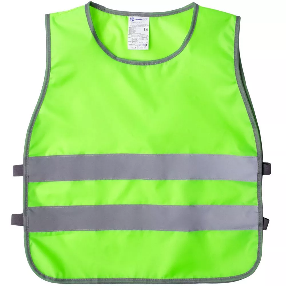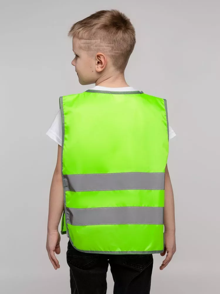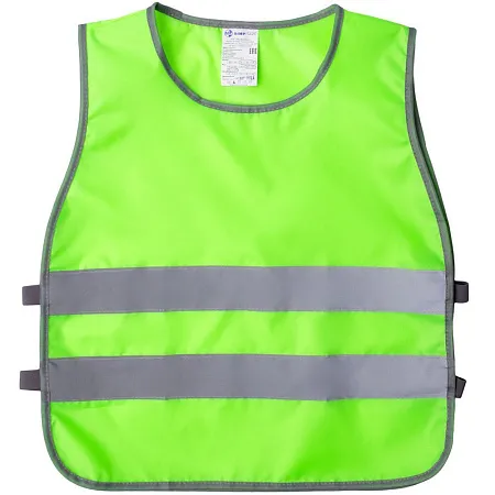 Детский светоотражающий жилет с застежкой-липучкой с одной стороны. Надевается через голову.