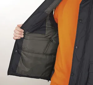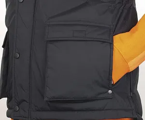 Два кармана спереди для рук, два кармана на груди для мобильного телефона, ручек и прочих мелочей, а также внутренний карман. Внутренний стягивающий шнур на талии. Эластичные плечики от ветра. Две молнии по бокам внизу для большей легкости движения, одна внутренняя молния на груди и одна — внизу жилета.