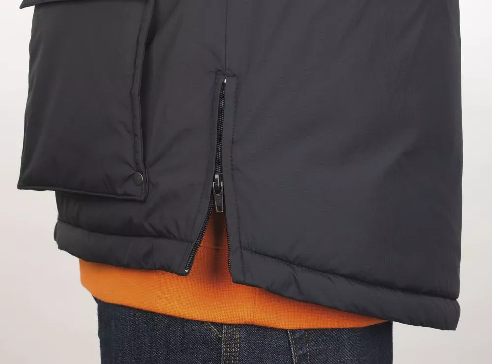 Два кармана спереди для рук, два кармана на груди для мобильного телефона, ручек и прочих мелочей, а также внутренний карман. Внутренний стягивающий шнур на талии. Эластичные плечики от ветра. Две молнии по бокам внизу для большей легкости движения, одна внутренняя молния на груди и одна — внизу жилета.