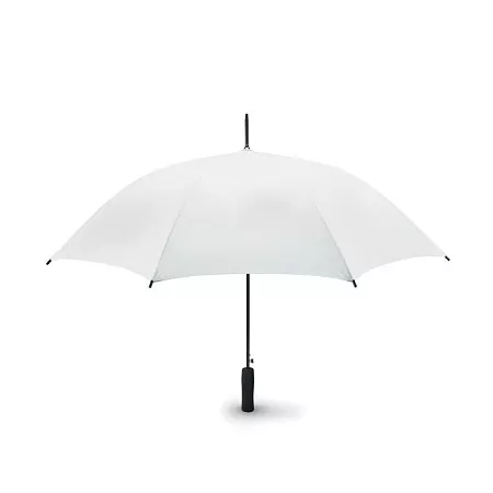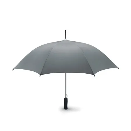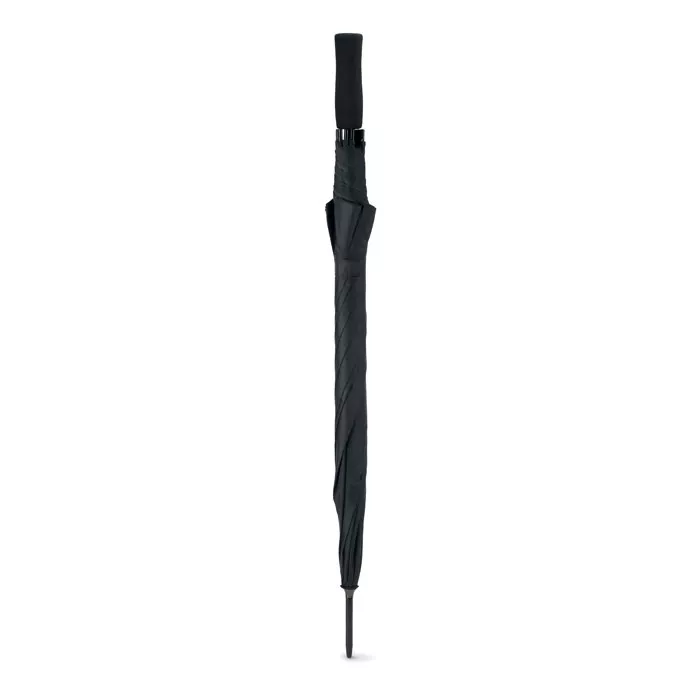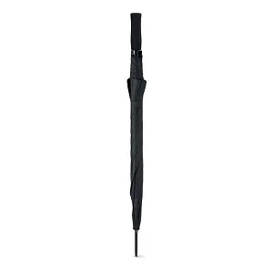 Зонт полуавтомат устойчивый к ветру с черным металлическим стержнем и черной пластиковой ручкой. Длина в сложенном виде 23 см.
