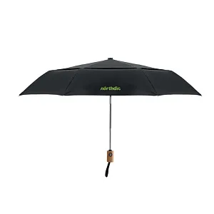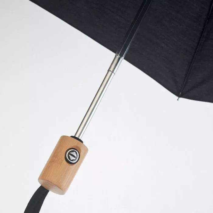 Ветроустойчивый зонт автомат 21 дюйм в 2 сложения из поликоттона 190T (70% полиэстера и 30% хлопка) с алюминиевыми стержнем и наконечниками и бамбуковой ручкой. Черные стекловолоконные спицы. В комплект входит подходящий чехол.