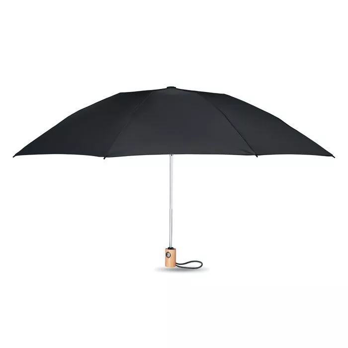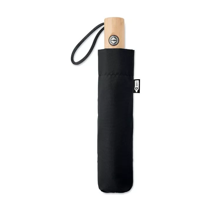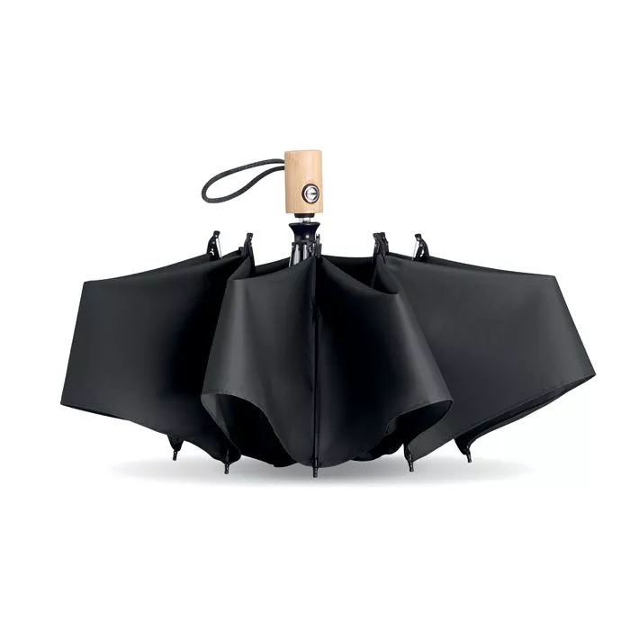 Зонт реверсивный 23-дюймовый из эпонжа RPET 190T. Автомат. Спицы из стекловолокна. Бамбуковая ручка с хлопковым ремешком на запястье. Футляр так же RPET.