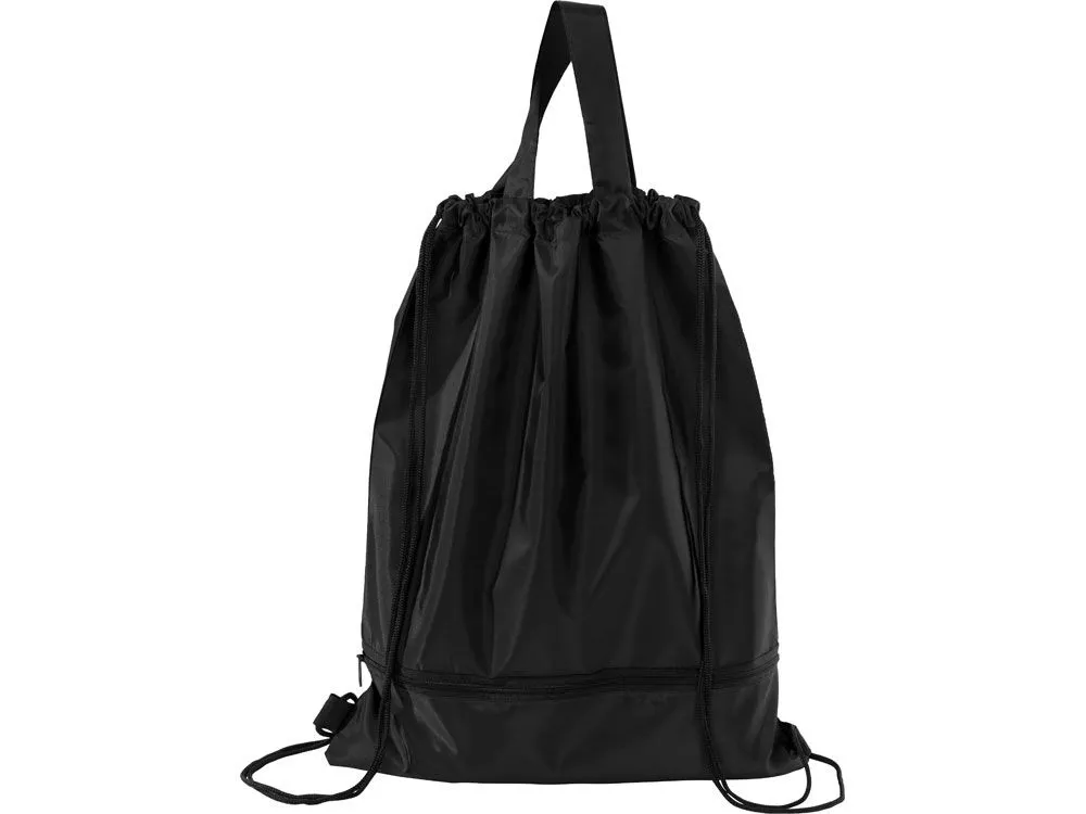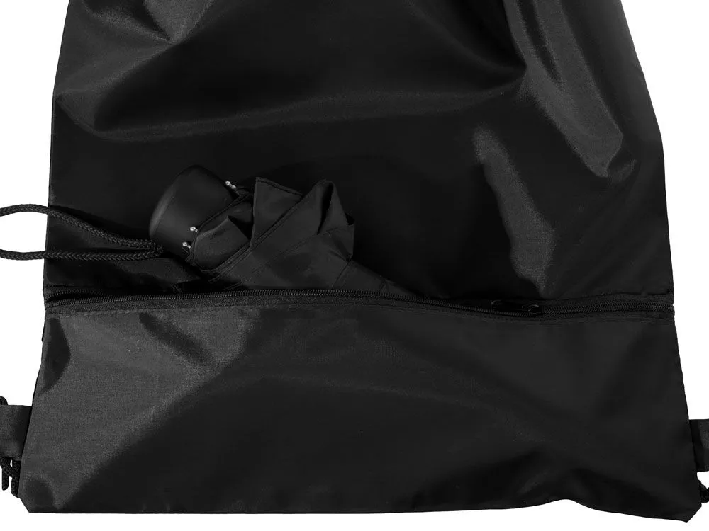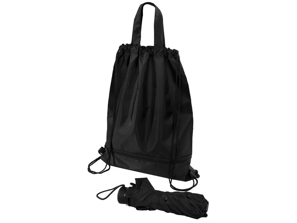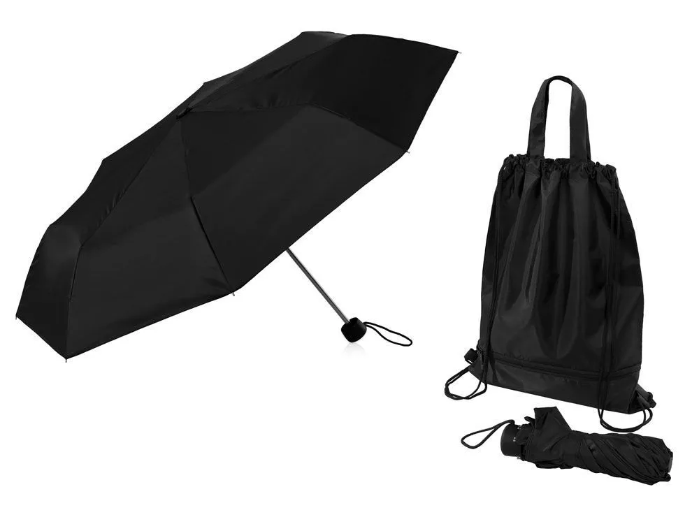 Механический зонт с прорезиненной ручкой идет в комплекте с сумочкой для покупок. На дне сумочки предусмотрен карман на молнии, в котором вы можете хранить зонт дома или прятать в него мокрый зонт, когда вы попали под дождь. Находясь в кармане сумочки, мокрый зонт не доставит неудобств. Сумочка имеет 2 варианта использования: шопер с двумя 2 ручками и рюкзак-мешок со шнурками. Трафаретная печать (1 цвет (цветные изделия)) на данный товар осуществляется бесплатно. Оплачивается только настройка оборудования в размере 8200 рублей на весь тираж.