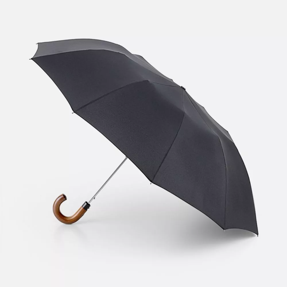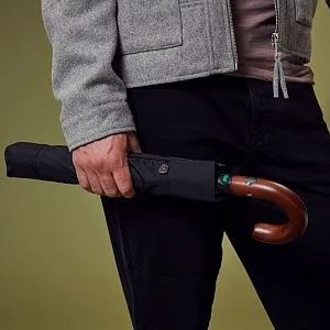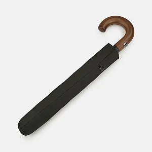 Идеальная модель для тех, кто не задается целью найти легкий и короткий складной зонт-«механику», а скорее обрадуется старому доброму увесистому и основательному полуавтомату. У модели ветроустойчивая конструкция. Рукоять выполнена из массива дерева и благодаря натуральности материала невероятно комфортно ощущается ладонью.